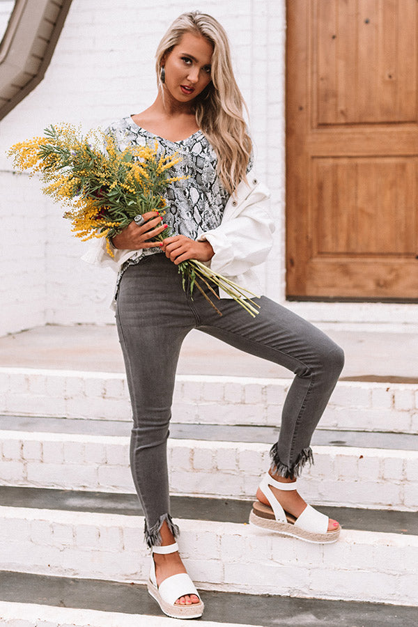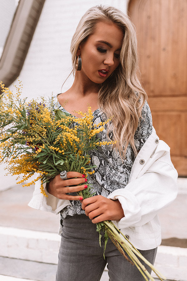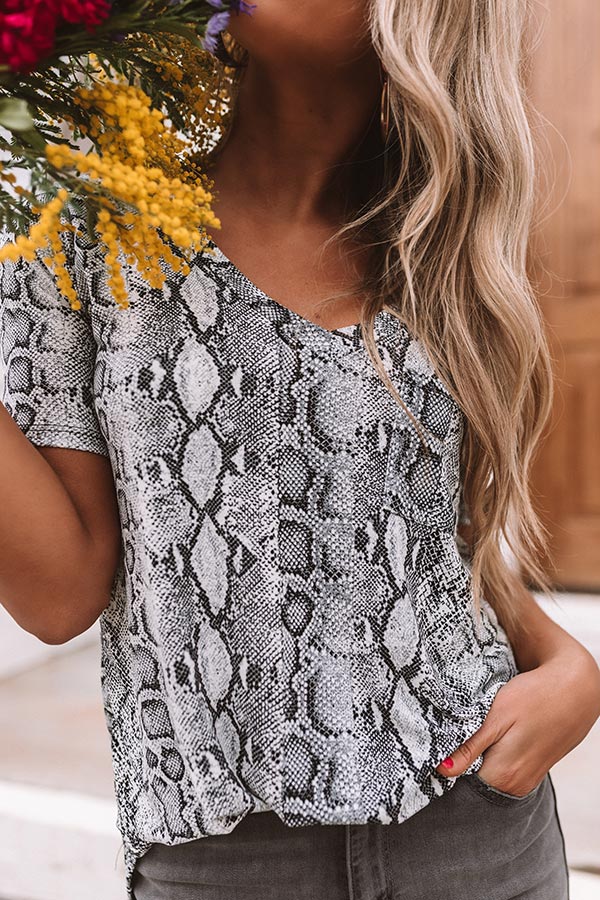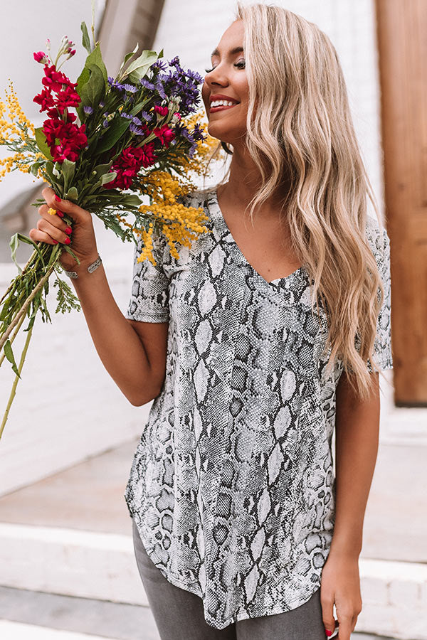 You will look like you live a life in the limelight when you wear this striking shift top featuring soft lightweight material patterned with a grey snake print, a v-cut neckline, short loose sleeves, and a relaxed t-shirt silhouette that falls into a rounded hemline! We have styled this fierce piece with some frayed vintage black skinnies and white espadrille sandals, but you can also wear it with some distressed denim shorts, "The Calum Bootie in Black," and our "Across The Universe Faux Leather Backpack in Black!" Measurements