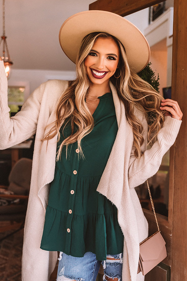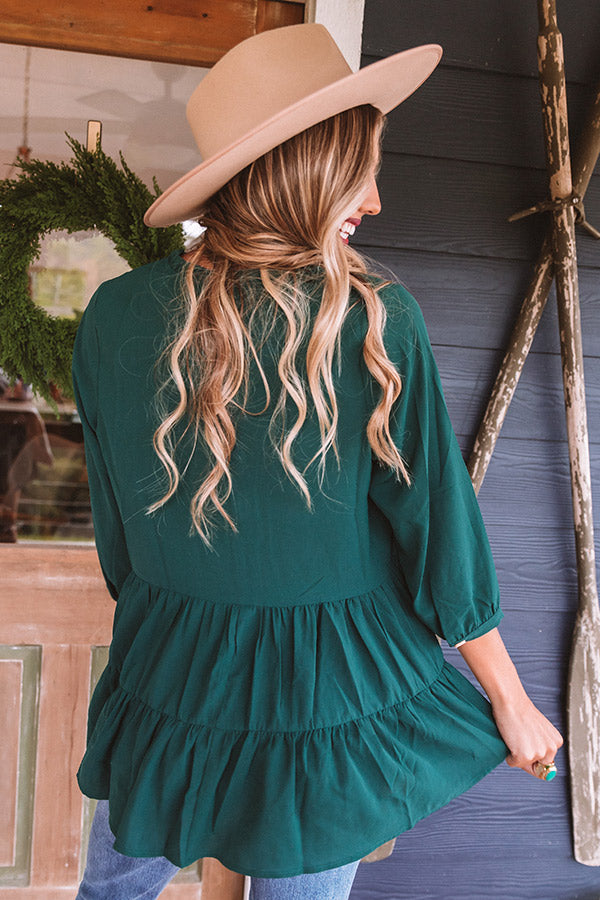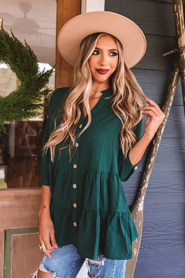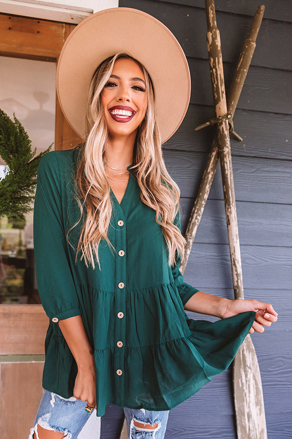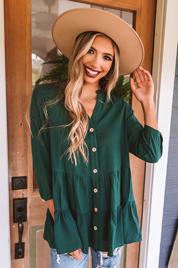 Our adorable hunter green colored "Limos And Lattes Shift Top" features lightweight material, a v-cut neckline with a ruffled collar, loose 3/4-length bishop sleeves with fitted cuffs, a button up front, and an ultra relaxed tiered silhouette that falls into an uneven tunic length hemline! Measurements