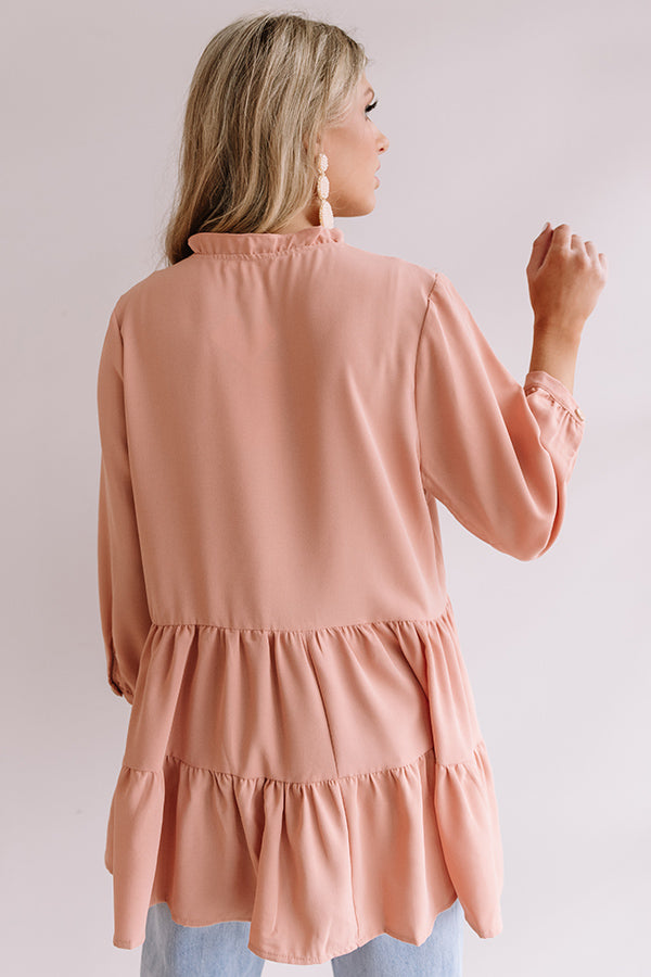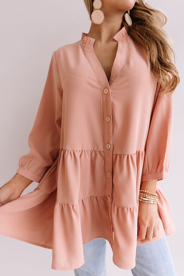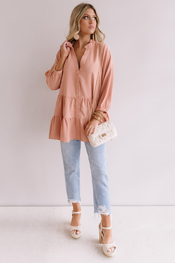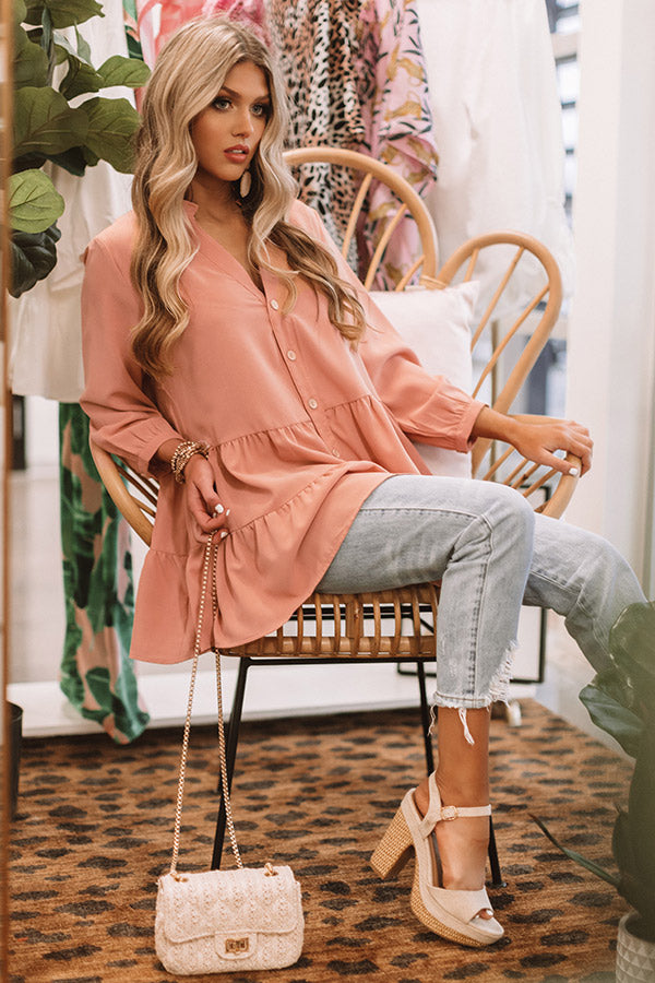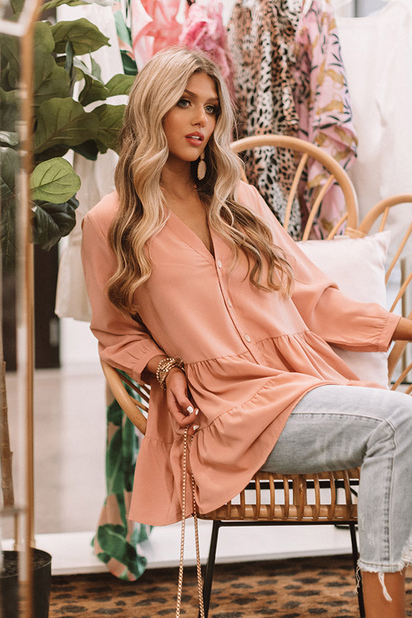 Our adorable peach colored "Limos And Lattes Shift Top" features lightweight material, a v-cut neckline with a ruffled collar, loose 3/4-length bishop sleeves with fitted cuffs, a button up front, and an ultra relaxed tiered silhouette that falls into an uneven tunic length hemline! We have styled this classic piece with some distressed light wash skinnies and a neutral platform heel and crossbody, but you can also wear it front tucked into some frayed denim shorts, "The Tipton Espadrille in Grey," our "All Caught Up Headband in Grey!" Measurements