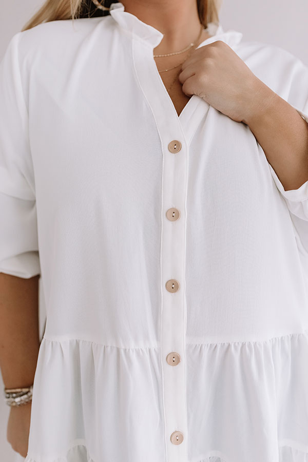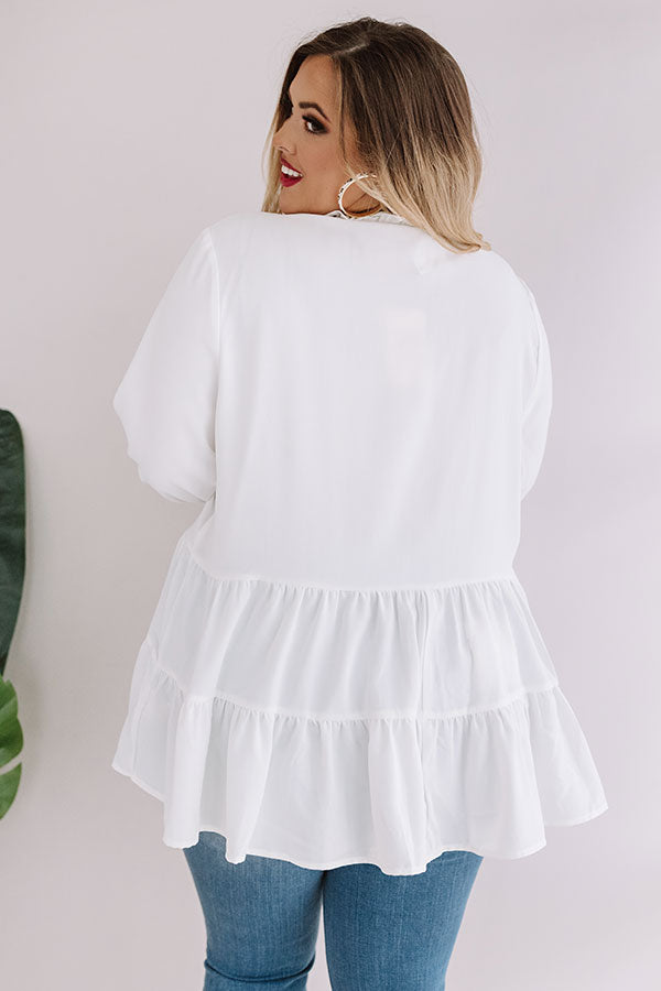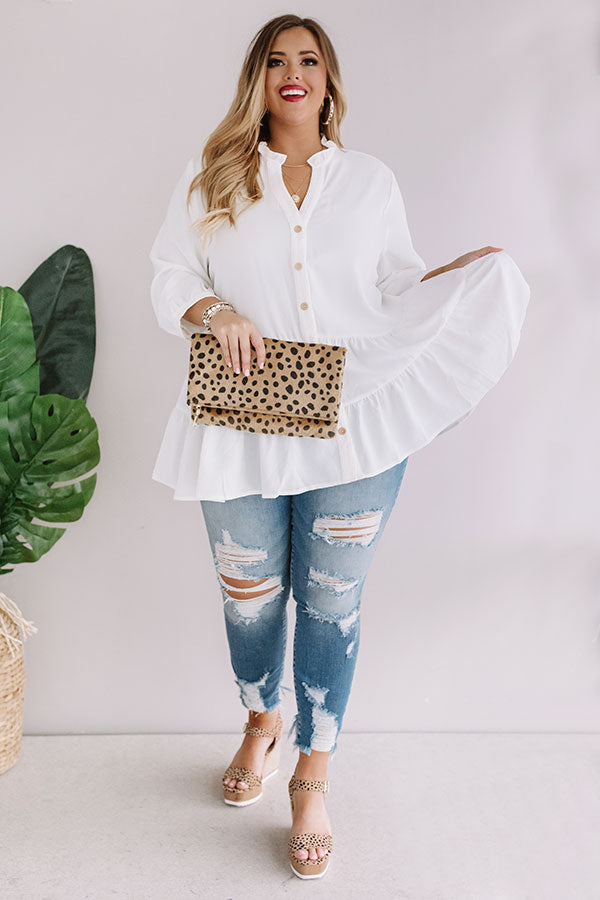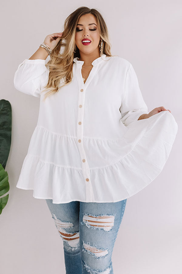 Plus Size - Our adorable white "Limos And Lattes Shift Top" features lightweight material, a v-cut neckline with a ruffled collar, loose 3/4-length bishop sleeves with fitted cuffs, a button up front, and an ultra relaxed tiered silhouette that falls into an uneven tunic length hemline! We have styled this classic piece with some distressed light wash skinnies and a cheetah print wedge and clutch, but you can also wear it front tucked into some dark wash flares, "The Lela Espadrille in White," our "Champagne And Chic Faux Leather Crossbody in Camel," and our "Girl About Town Plaid Headband in Primrose Yellow!" Measurements