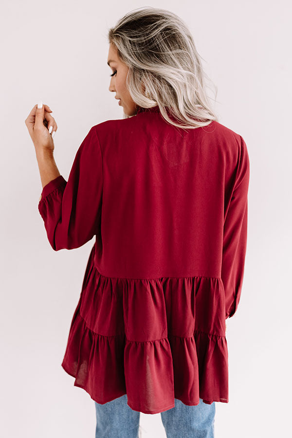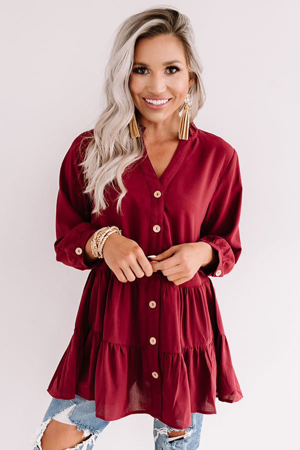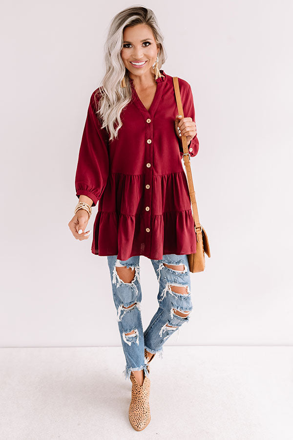 Our adorable wine colored "Limos And Lattes Shift Top" features lightweight material, a v-cut neckline with a ruffled collar, loose 3/4-length bishop sleeves with fitted cuffs, a button up front, and an ultra relaxed tiered silhouette that falls into an uneven tunic length hemline! Measurements