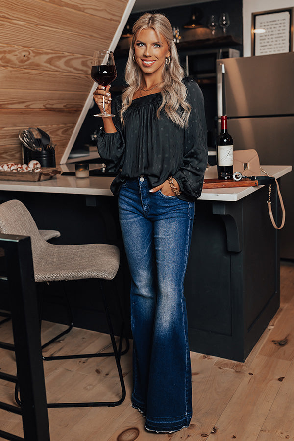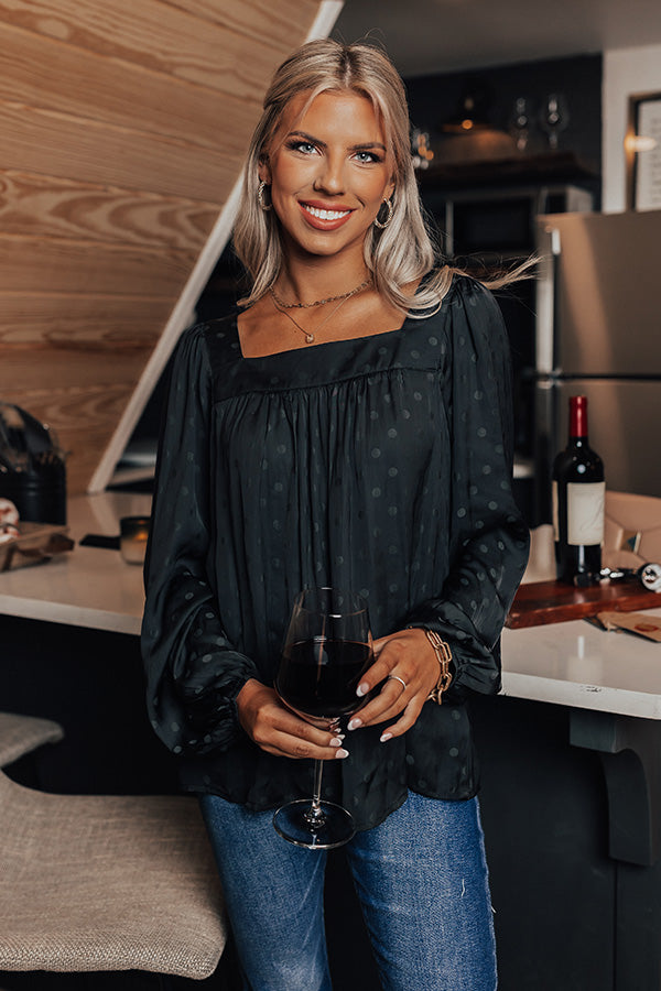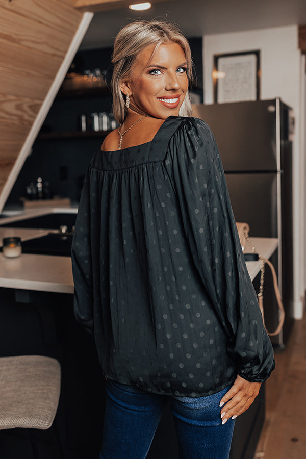 Our darling black 'Link Up Shift Top' features lightweight flowy material patterned with a subtle polka dot print, a square neckline and upper back, long loose sleeves, and a relaxed silhouette that falls into a straight hemline!