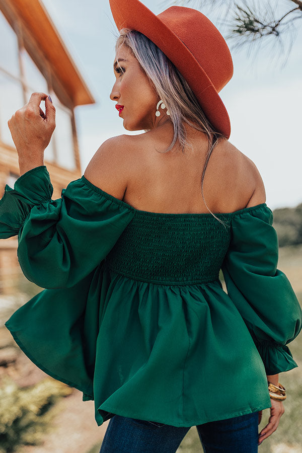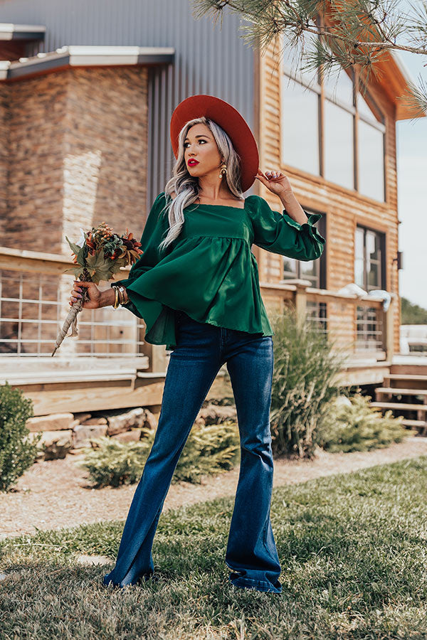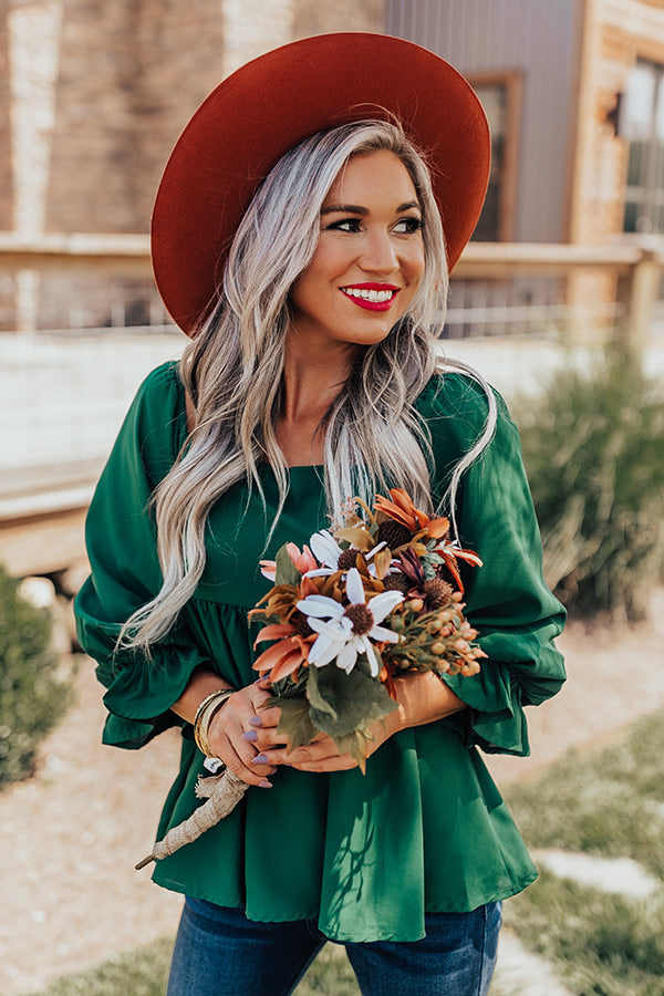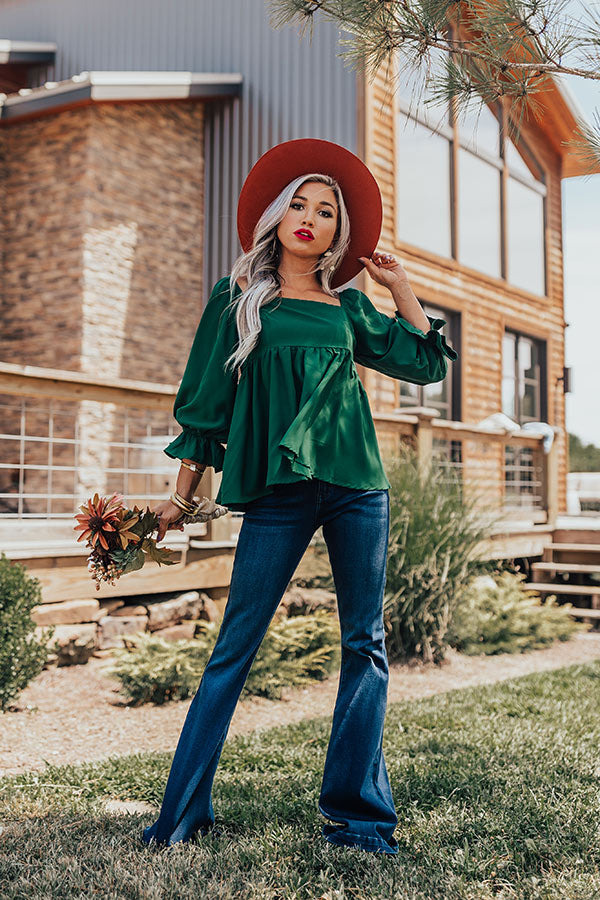 Complete your look with elegance in our chic hunter green colored 'Lipstick And Lattes Top' featuring lightweight flowy material, a square neckline and upper back, 3/4-length bishop sleeves with flared cuffs, and a relaxed silhouette that falls into a straight hemline!