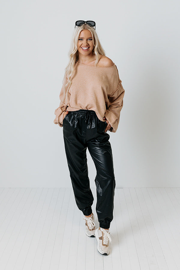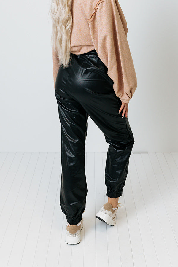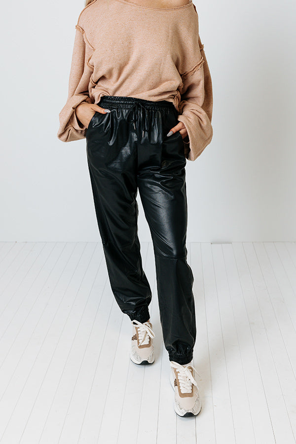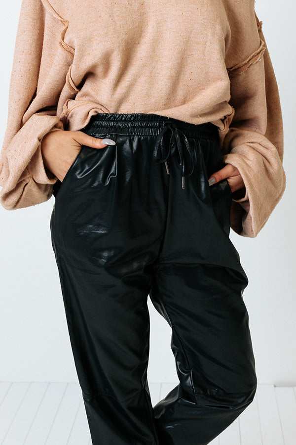 Make the streets your runway in our sleek black 'Living Downtown' joggers featuring faux leather material, an elastic waistline with a tie closure, accent side pockets, and a relaxed pants silhouette that tapers into fitted ankle-length hemlines!
