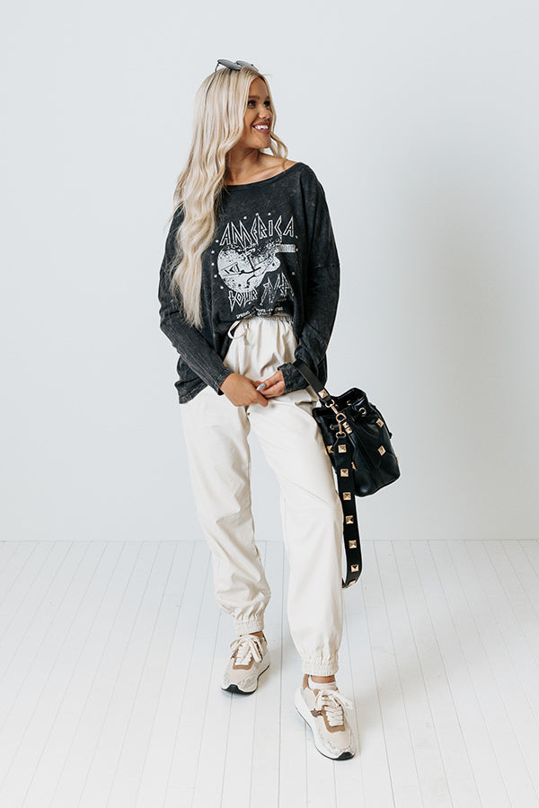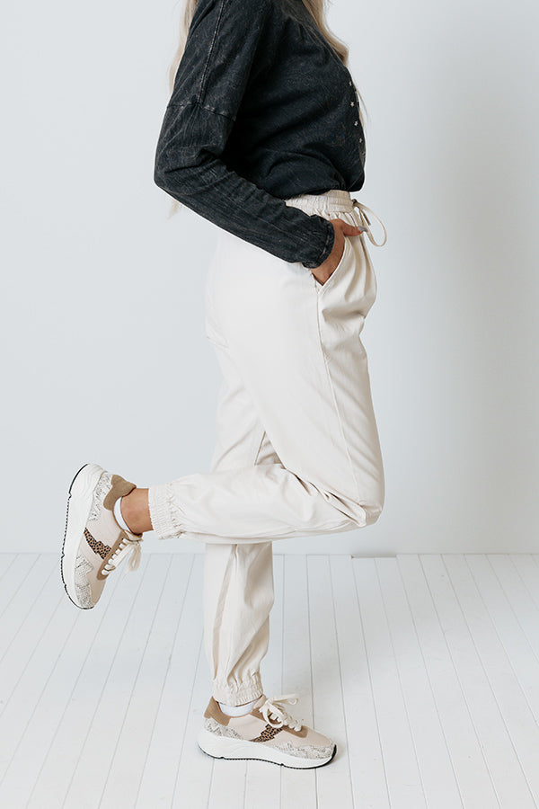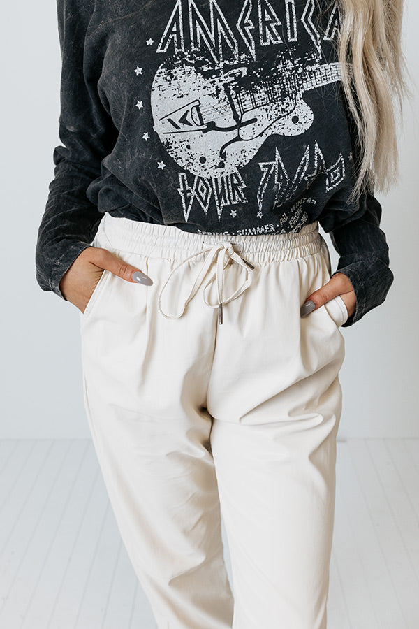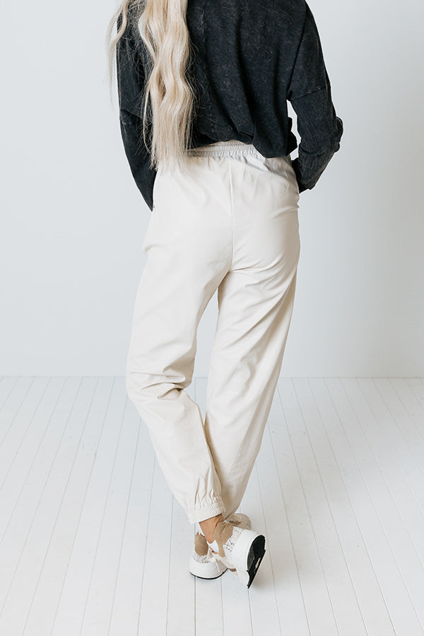 Make the streets your runway in our sleek cream colored 'Living Downtown' joggers featuring faux leather material, an elastic waistline with a tie closure, accent side pockets, and a relaxed pants silhouette that tapers into fitted ankle-length hemlines!