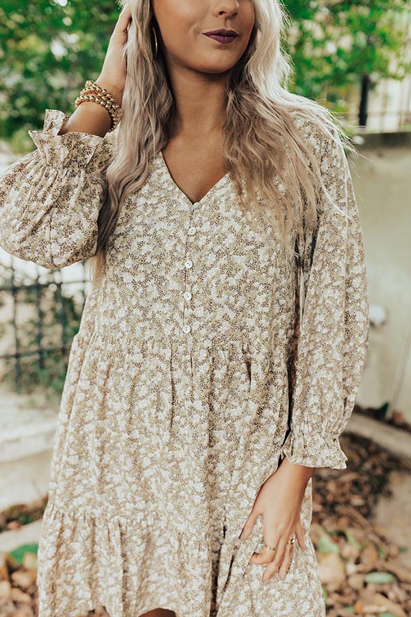 Arrive in style with our pretty light beige colored 'Living For Love' dress featuring lightweight flowy material patterned with a small white floral print, a button up bodice with a v-cut neckline, long bishop sleeves with flared cuffs, and a relaxed silhouette that falls into a wide mid-thigh length peplum hemline!