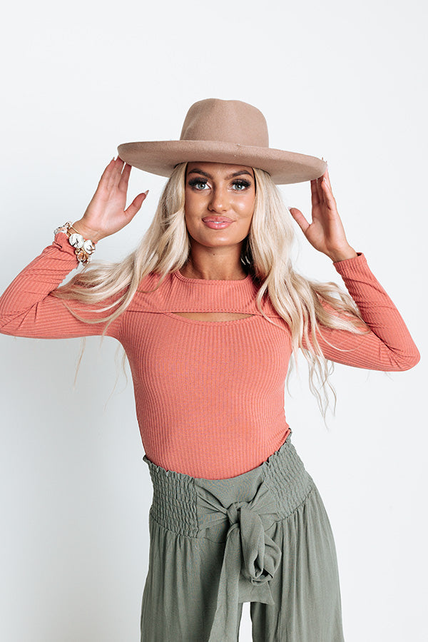 Take your fall wardrobe to the next level with our flirty light rustic rose colored 'Living For Love' bodysuit featuring lightweight and stretchy material with vertical ribbed texturing, a cutout bodice with a rounded neckline, long sleeves, and a flattering figure hugging silhouette that ends in cheeky fit bottoms with a snap button!
