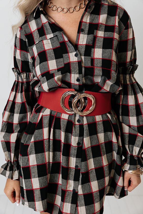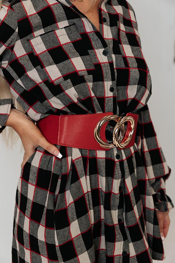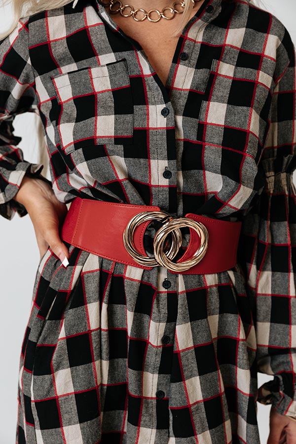 Live your life in style with this chic belt featuring a wide elastic red strap with an oversized interlocking gold hoop buckle! This belt fits up to a size 10.