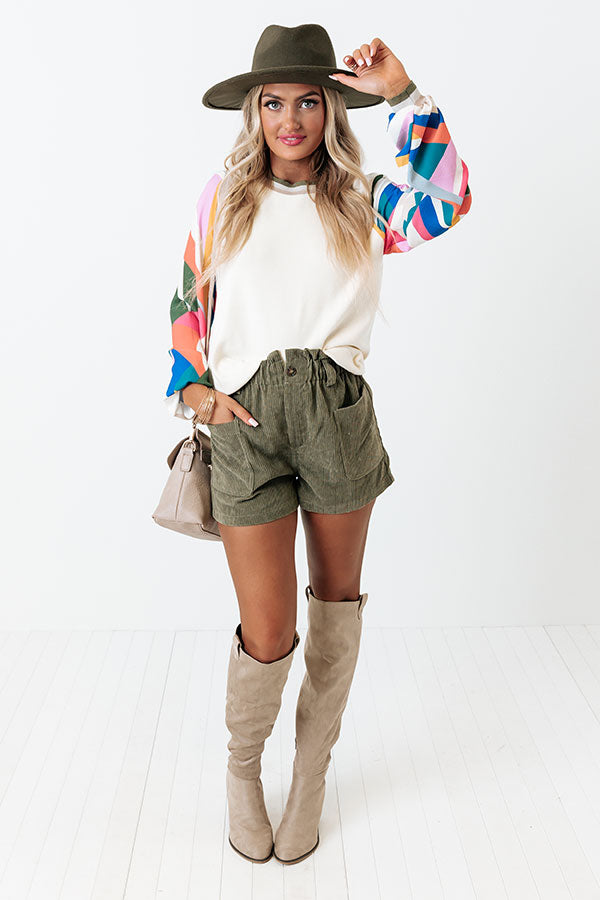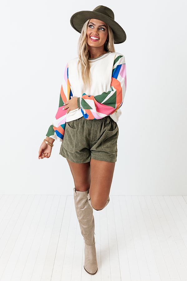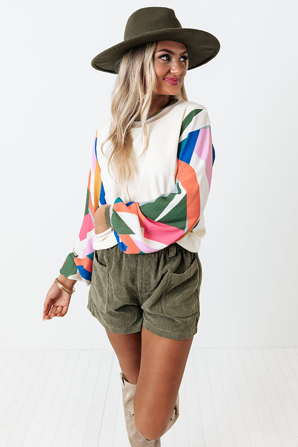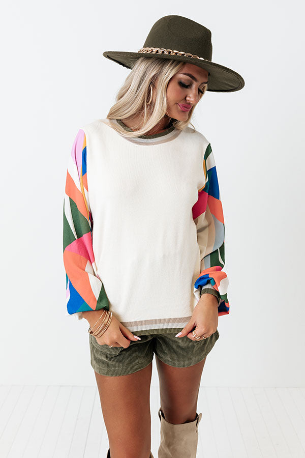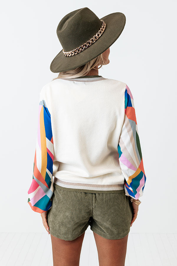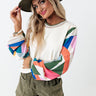 You will be living the good life when you complete your look with this adorable white sweater top featuring soft material, a rounded neckline, long loose sleeves patterned with a geometric pink, yellow, blue, and orange print, striped trim detailing, and a relaxed silhouette that falls into a straight hemline! Measurements