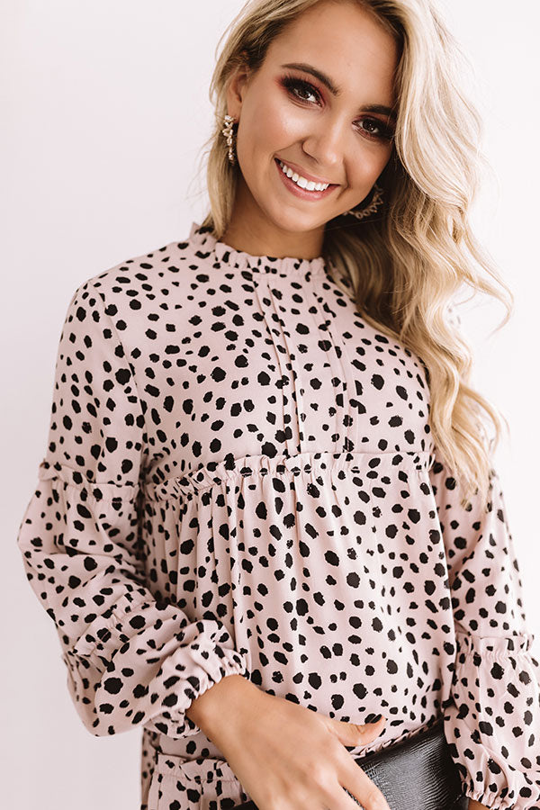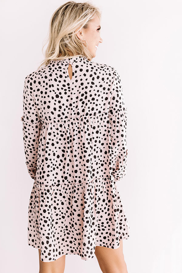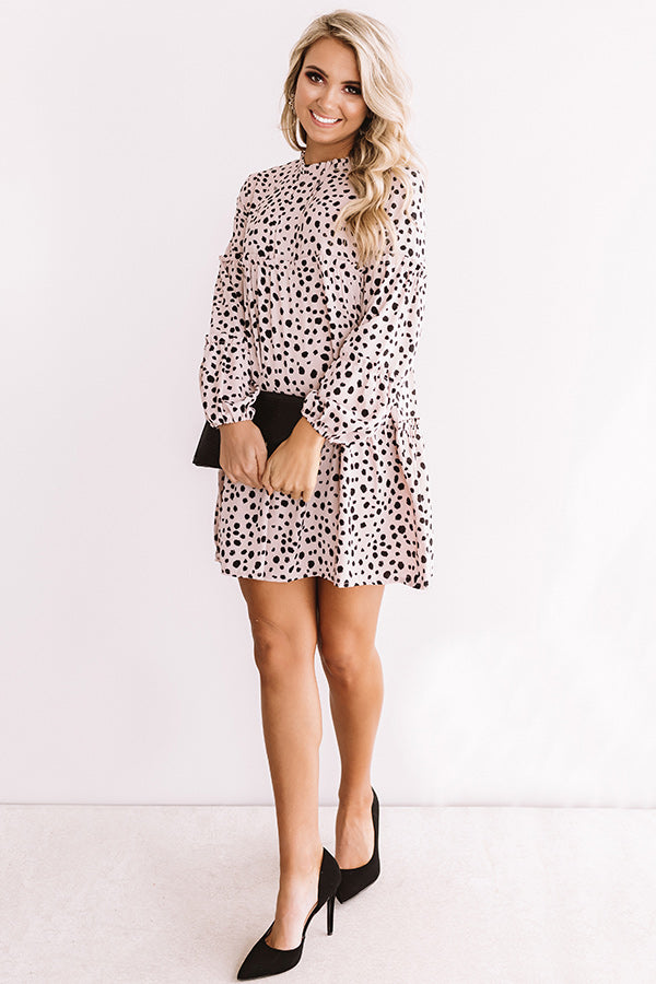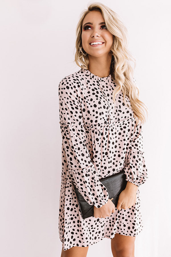 You will be "living the leopard dream" when you wear this adorable shift dress featuring a bold black pattern, lightweight material, a high rounded collar with ruffled trim, a keyhole accented upper back with a button closure, long loose bishop sleeves with elastic banded cuffs, subtle pleat detailing on the bodice, and an ultra relaxed tiered silhouette that falls into a straight mid-thigh length hemline! You can style this piece with a chic black pump and clutch, or you can pair it with "The Underwood Faux Leather Wedge in Dusty Purple" and our "All Caught Up Headband in Black!" Measurements