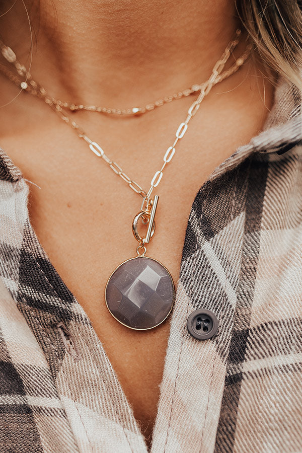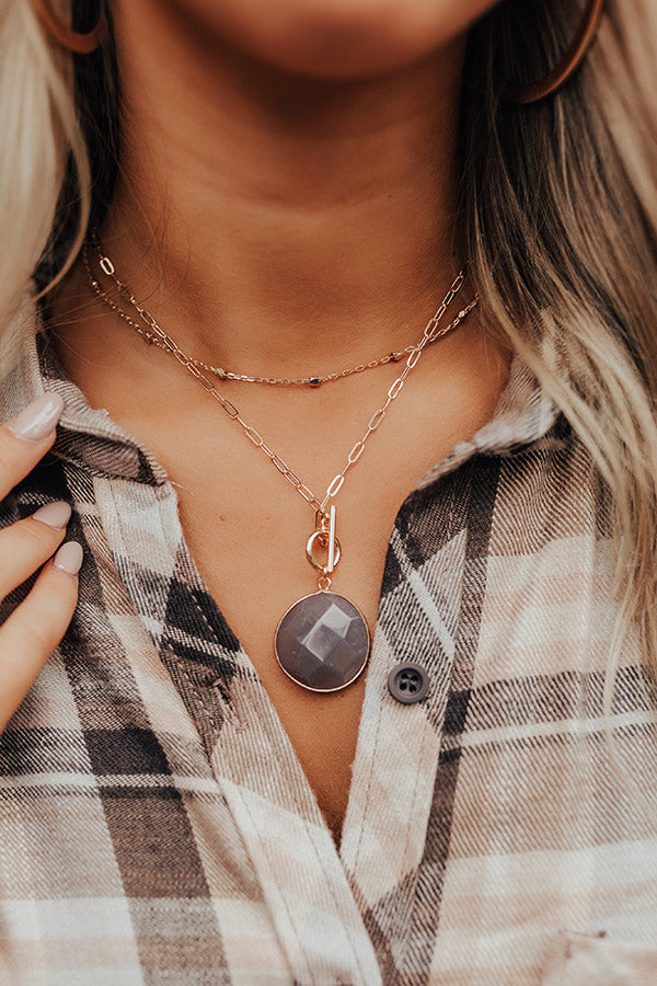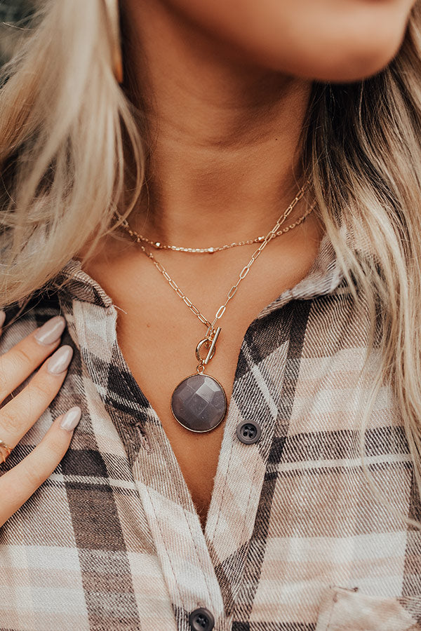 Add a pretty flair to any look by accessorizing with this layered gold necklace featuring a short dainty chain with tiny bead detailing and a longer link chain with a toggle closure and circle dark grey pendant!