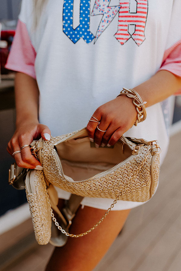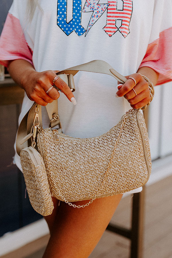 Designer inspired, our luxe beige colored 'Local Guide' crossbody features lightweight raffia material, a wide adjustable and removable shoulder strap with a removable zip closure pouch, a dainty chain link handle, and a a spacious filly lined interior with a zip closure and an additional zip closure pouch!