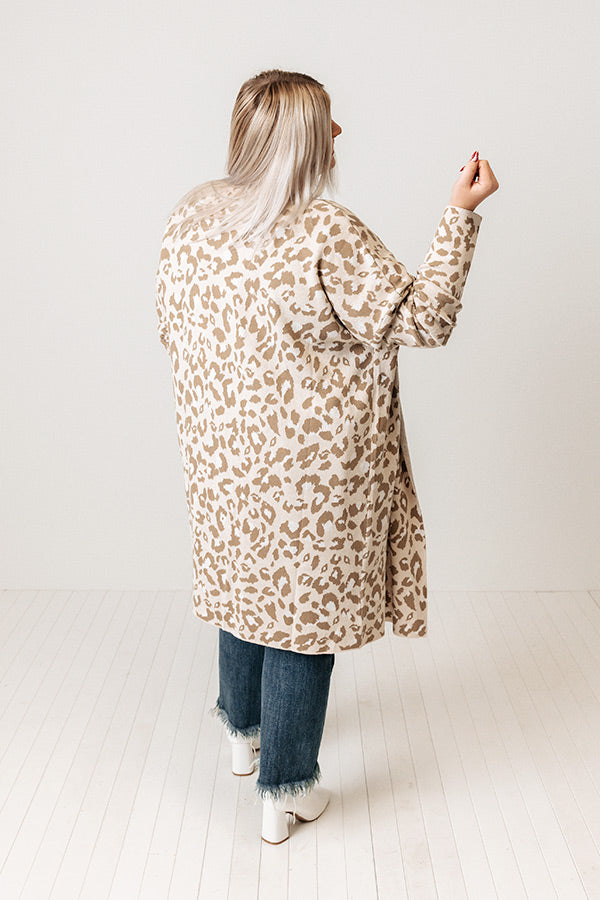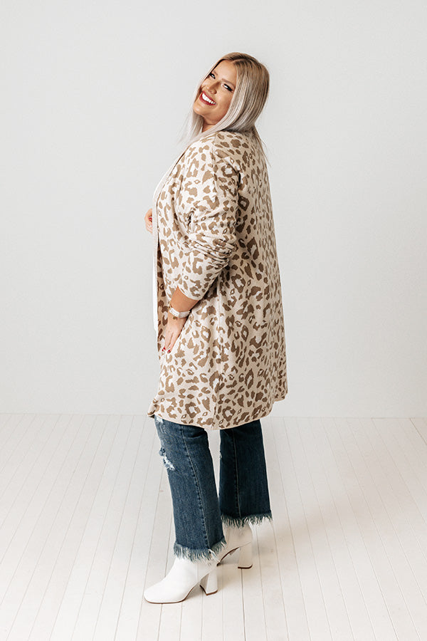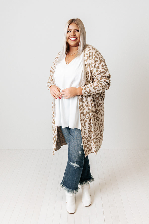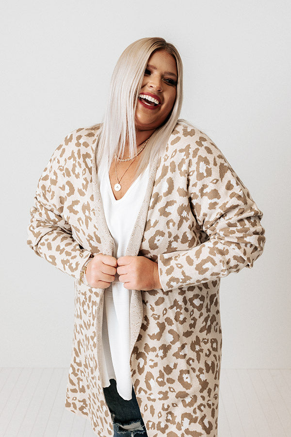 Layer up on the wild side with our cute plus size light birch hued 'Locked Up' cardigan featuring soft and lightweight knit material patterned with a large natural colored leopard print, long loose sleeves, and a draped open-front silhouette that falls into a straight knee-length hemline!