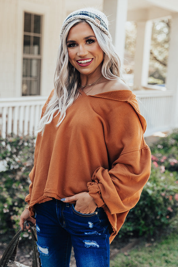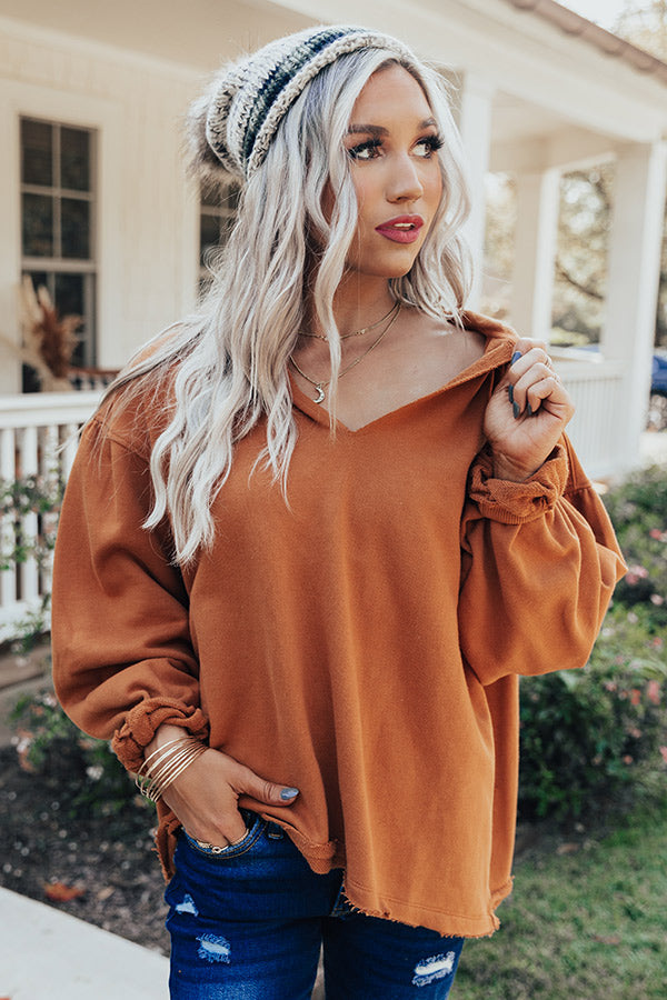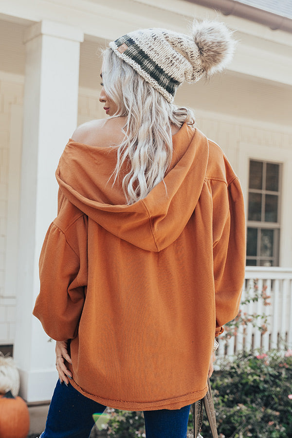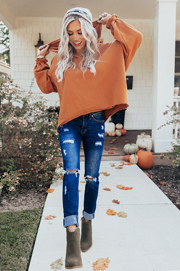 Life's a party, so dress like it in this festive pumpkin colored hoodie featuring soft lightweight material, long loose sleeves with fitted cuffs that can be rolled, a wide v-cut neckline with a hooded back that can be worn off one shoulder, and a slouched silhouette that ends in an uneven raw-cut hemline! Measurements