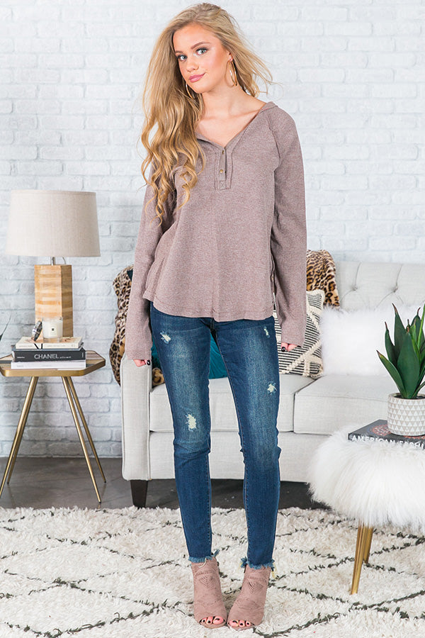 When the fall weather calls for "lodges and lattes" there is no better piece to keep you warm than this warm taupe henley top featuring a button up v-cut neckline, waffle knit texturing, long loose sleeves, exposed seams, and a relaxed bodice with a rounded hemline that looks great tucked in! We have styled this piece with some frayed ankle skinnies and a neutral bootie, but you can also wear it with some white flares and wine accessories like "The Celine Peep Toe Bootie," and our "Say It Ain't Soho Hat!" Measurements