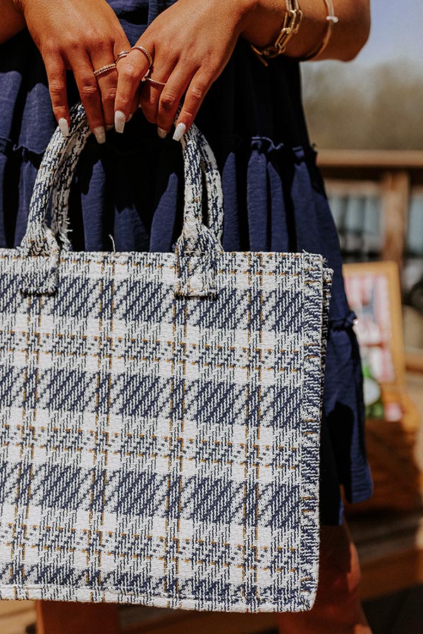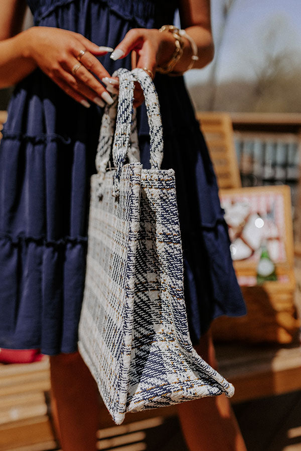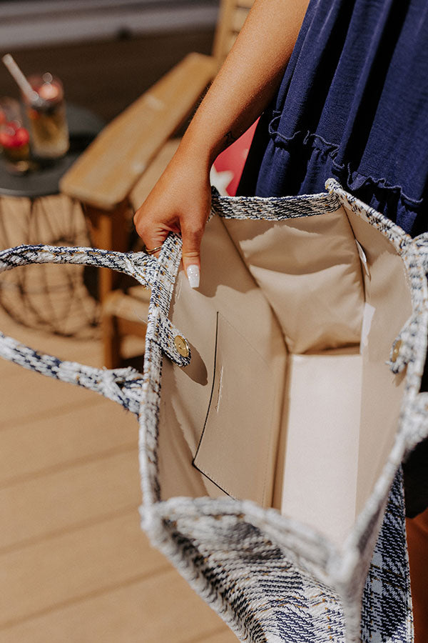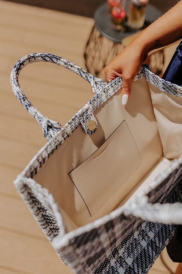 Our luxe designer inspired 'London Estate' tote features navy and white tweed material, two tote handles, and a spacious interior with a snap button closure!