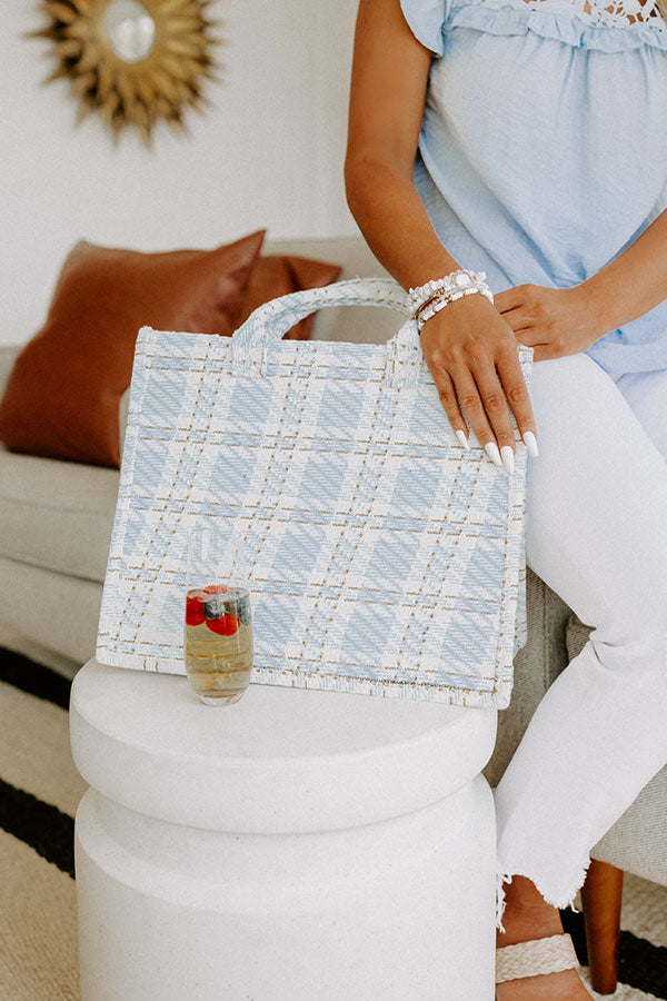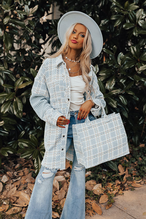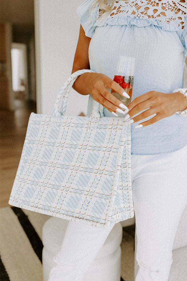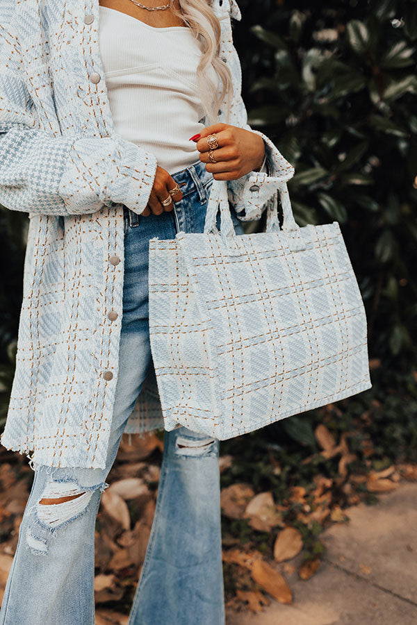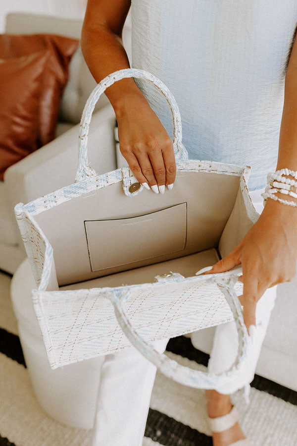 Our luxe designer inspired 'London Estate' tote features sky blue and white tweed material, two tote handles, and a spacious interior with a snap button closure!