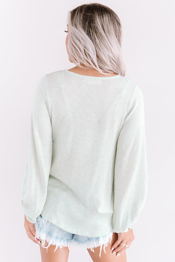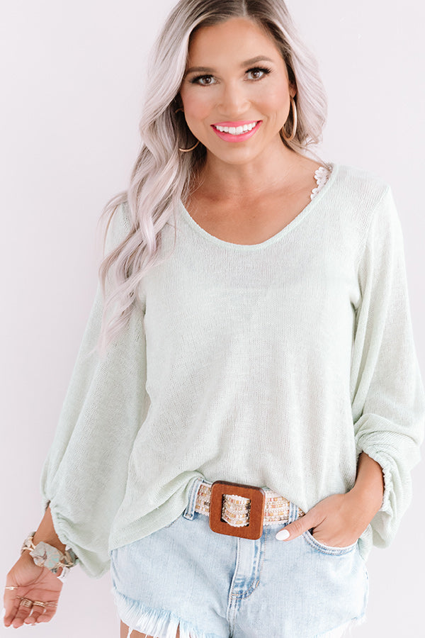 Slay all day in our simple but significant mint colored "London Leisure" top featuring ultra lightweight tight knit material with subtle texturing, a scooped neckline, long oversized bubble sleeves with fitted elastic banded cuffs, and a relaxed silhouette that falls into a rounded hemline! We have styled this everyday essential with some frayed light wash shorts, a statement belt, and a neutral wedge and tote, but you can also wear it with some white skinnies, "The Melina Faux Leather Heel in Mint," and our "Sippin' At Sunset Sunnies in White!" Measurements