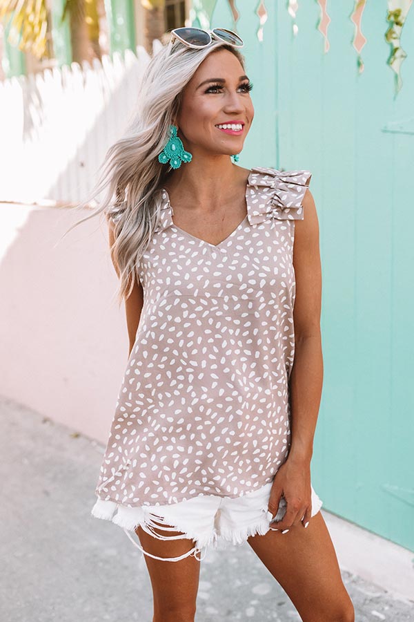 Slay all day in our adorable neutral hued "London Lullaby Shift Tank" featuring lightweight material patterned with a spotted white print, a v-cut neckline and upper back, wide shoulder straps with oversized ruffled detailing, and a relaxed silhouette that falls into a straight hemline! We have styled this cutie with some distressed white shorts, turquoise statement jewelry, sunnies, and neutral platform heels, but you can also wear it layered under a distressed denim jacket with some frayed black skinnies, "The Seraphina Faux Leather Wedge in Taupe," and our "Right On Cue Fringe Crossbody in White!" Measurements