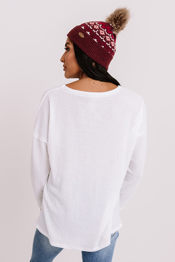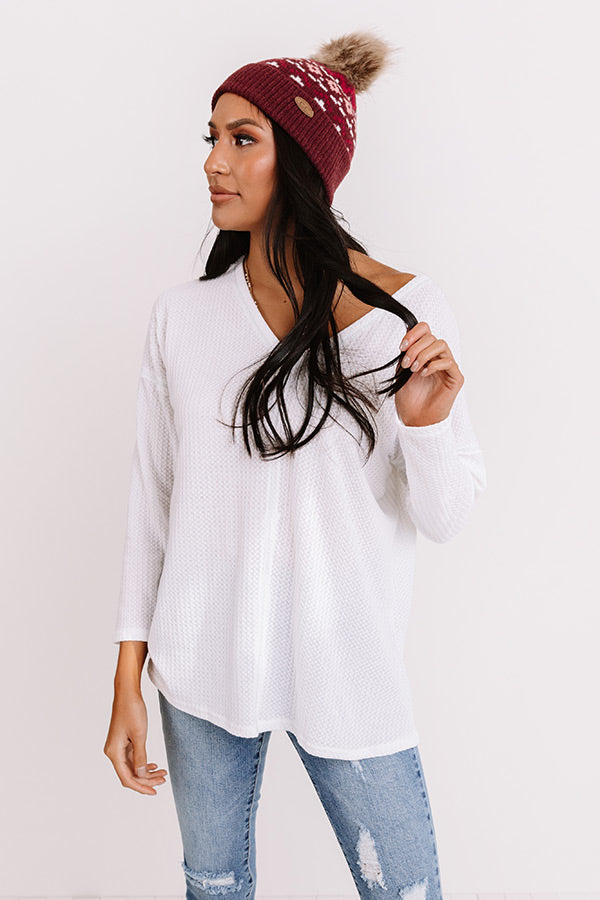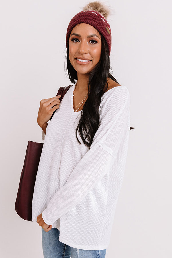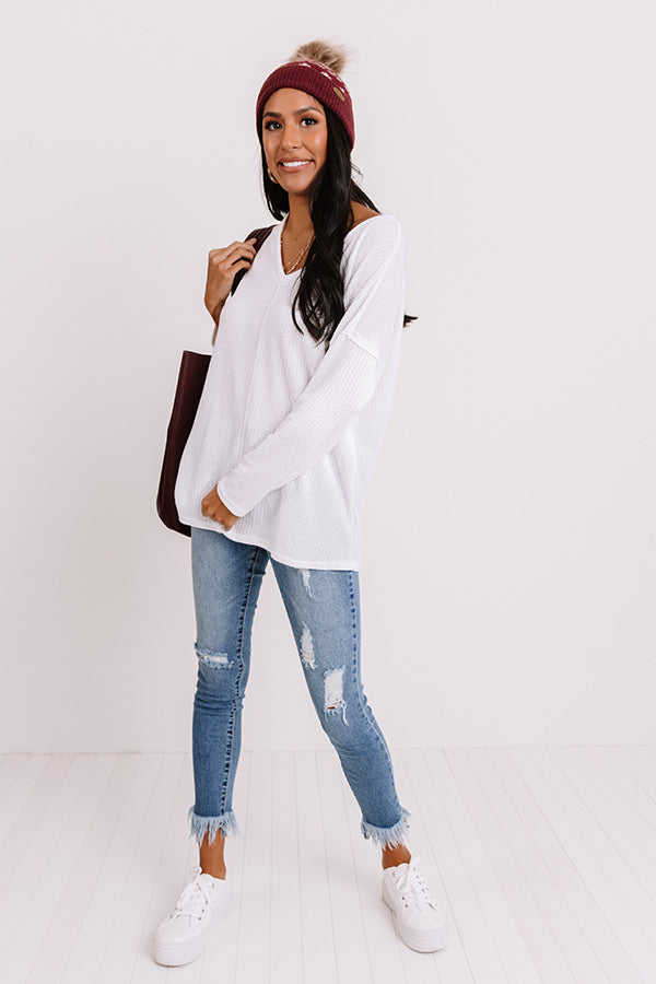 Get ready effortlessly in our versatile white 'London Shops' top featuring lightweight flowy material with waffle knit texturing, a v-cut neckline, long loose sleeves, and a slouched silhouette that falls into a straight hemline! Measurements