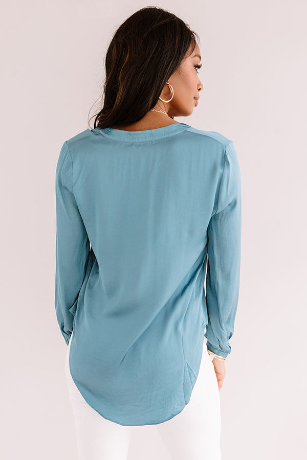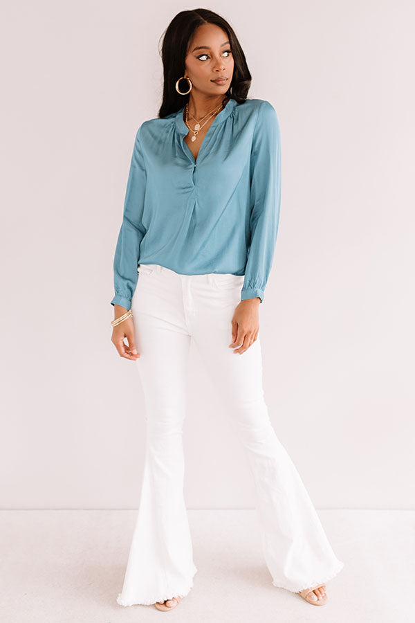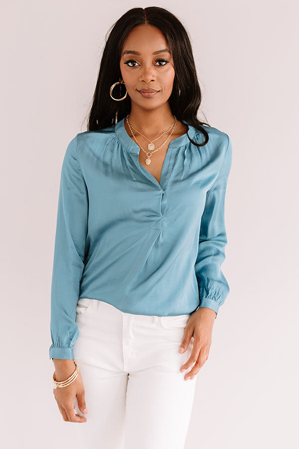 Showcase your inner girl boss in our sophisticated but elegant ocean blue colored "London Skyline" top featuring sleek lightweight satin material, a button up bodice with a high rounded neckline, long loose sleeves with fitted button closure cuffs, and a relaxed silhouette that falls into a rounded hemline! This versatile piece styles perfectly with some white flares and dainty gold jewelry, but you can also wear it tucked into "The Celia High Waist Trousers in Tan," "The Shaney Heel in Natural," our matching "Boston Balcony Floral Hair Scarf," and our "All The Way Embellished Clutch in Tan!" Measurements