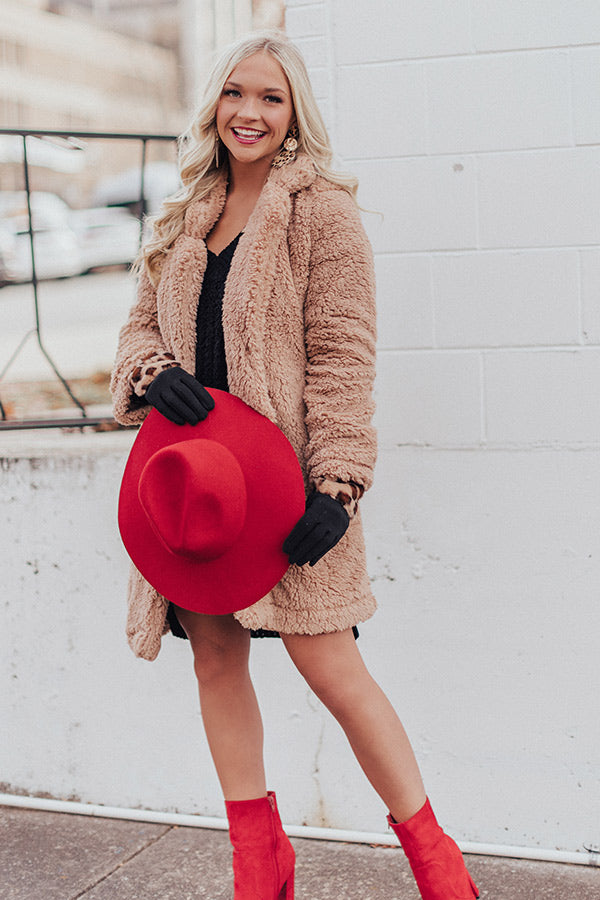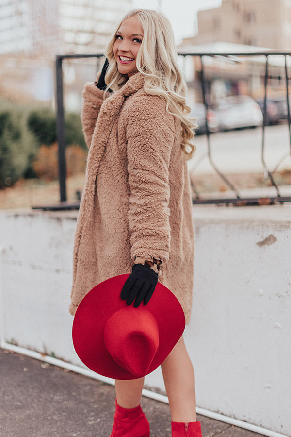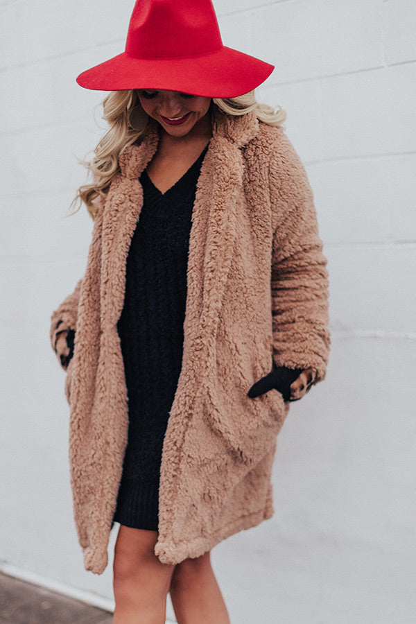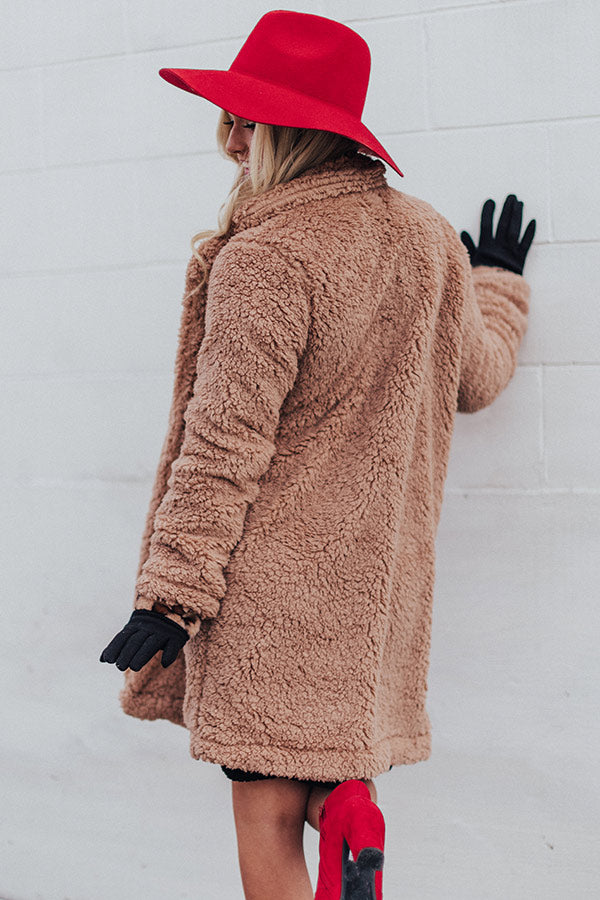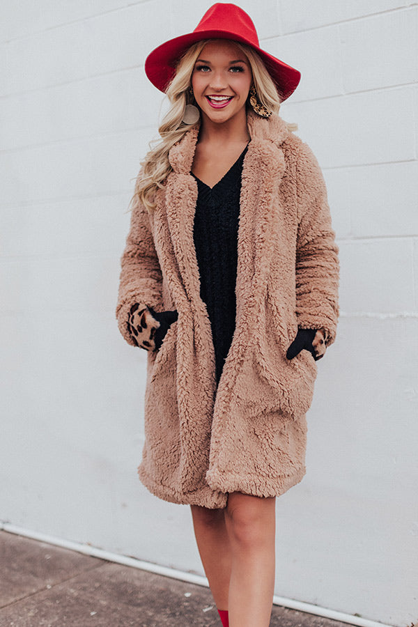 Stay warm and protected from the chilly "London snowfall" with this adorable iced latte colored coat featuring soft and thick sherpa material, long loose sleeves, a collard flap neckline with v-cut accent notches, low hidden accent pockets, and a relaxed single snap button silhouette that falls into a straight mid-thigh length hemline! You can layer this ultra warm and versatile piece with just about anything from a basic tank to a sweater, jeans to skirts or dresses, booties to wedges or sandals, clutches to totes, and hats to earrings! Measurements
