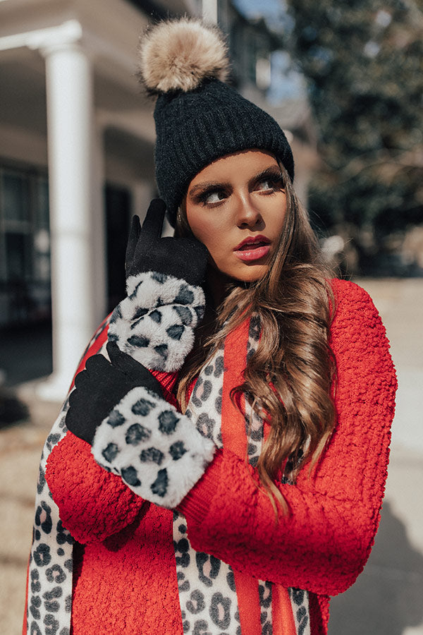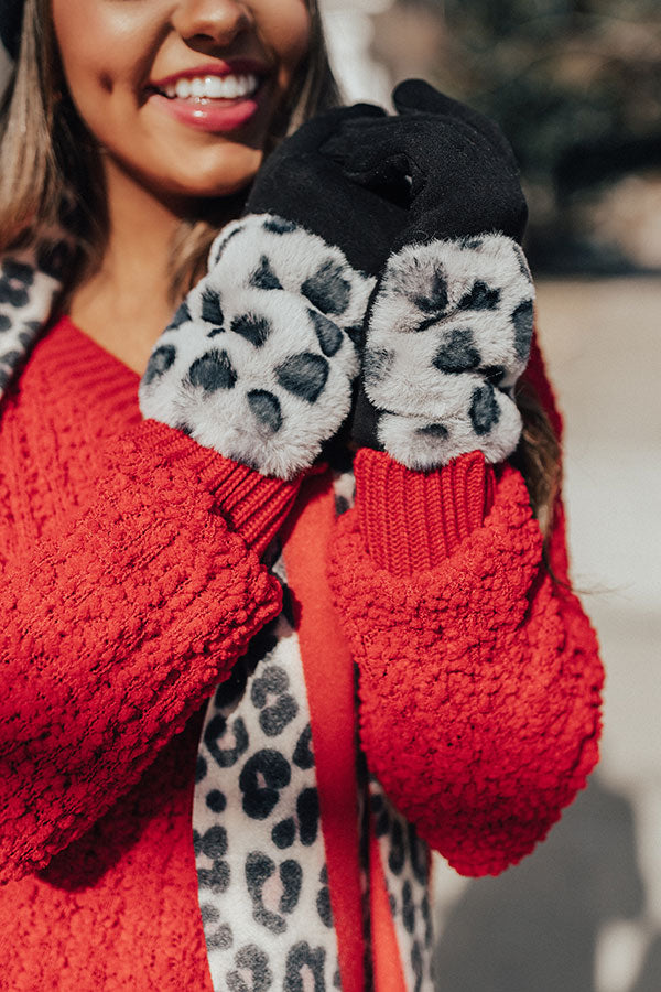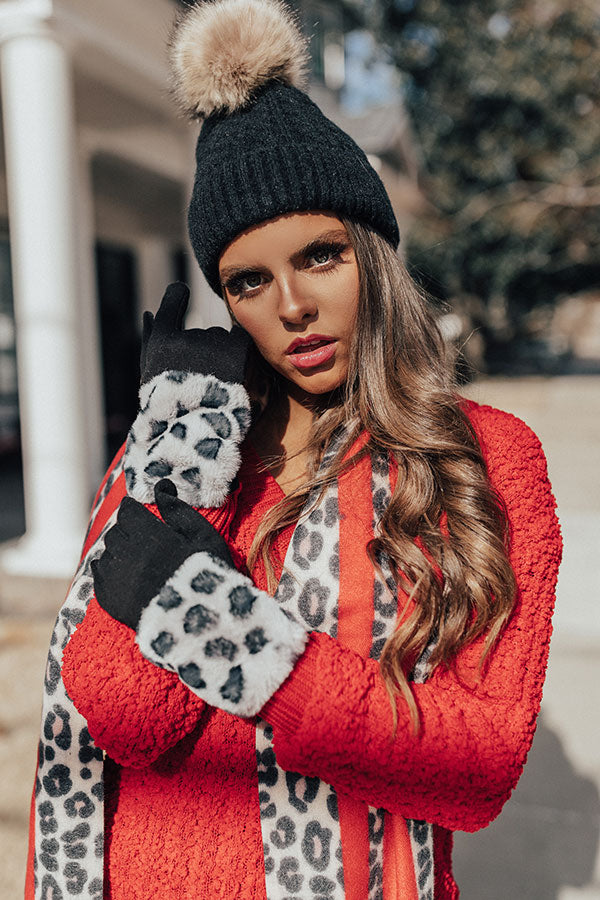 Stay extra warm and protected from the chilly "London snowfall" with these adorable grey smart touch gloves featuring soft lightweight tight knit material and outer faux fur detailing patterned with a bold black leopard print!
