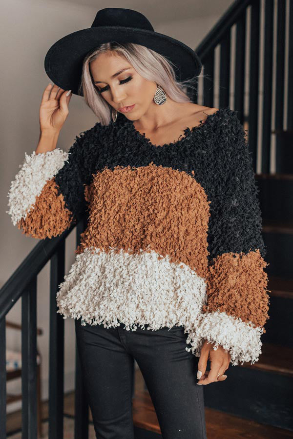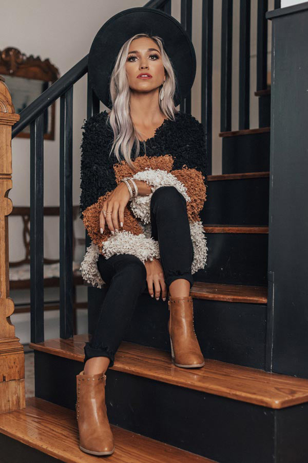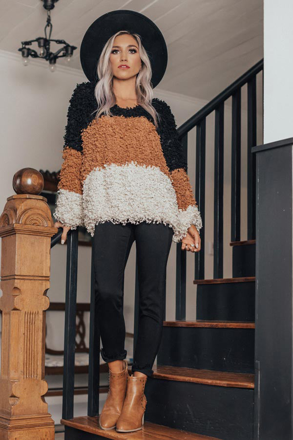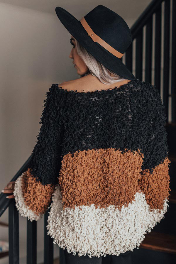 Cozy up for winter in our "London Times" sweater featuring ultra soft lightweight material with thick popcorn knit texturing, horizontal color block accent stripes, a wide v-cut neckline that can be worn off one shoulder, long oversized bishop sleeves with fitted cuffs, and a relaxed silhouette that falls into a straight hemline! We have styled this adorable piece with some black skinnies, neutral booties, and a matching faux suede hat, but you can also wear it with some light wash denim flares, "The Jess Faux Leather Heel in Natural," and "The Real Deal Faux Leather Tote in Cinnamon!" Measurements
