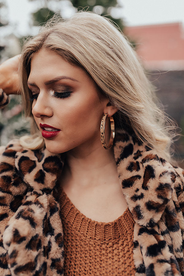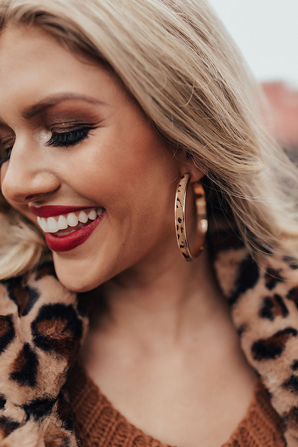 You are sure to steal the show when you accessorize with our "Long Distance Love" statement earrings featuring brown faux hide hoops patterned with a black and brown leopard print!