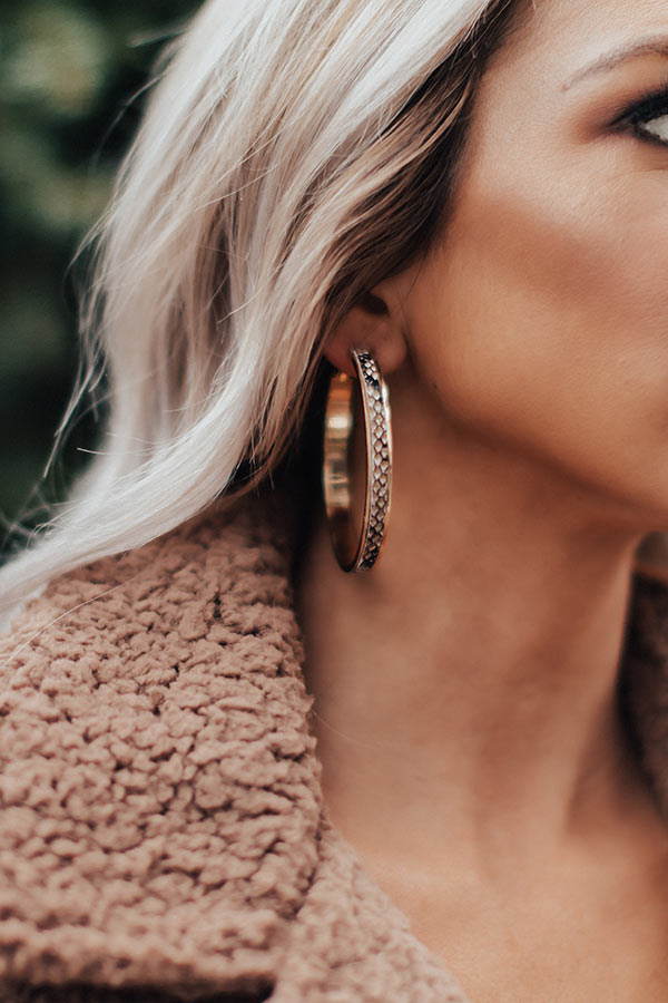 You are sure to steal the show when you accessorize with our "Long Distance Love" statement earrings featuring faux leather hoops patterned with a black and neutral snake print!