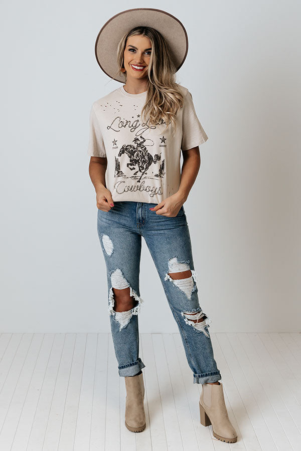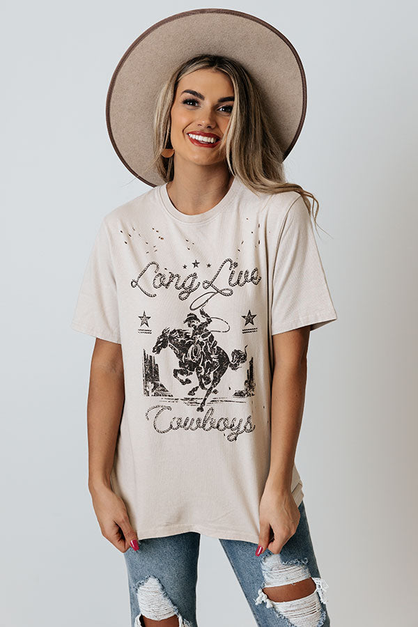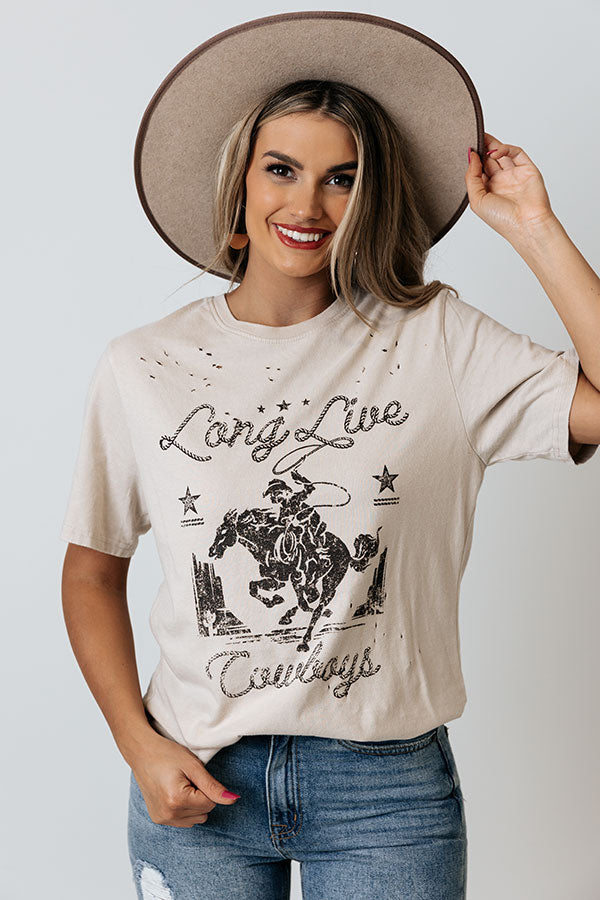Live out your wild west dreams with our adorable birch hued 'Long Live Cowboys' tee featuring soft lightweight material with a cute western graphic on the front, a rounded neckline with subtle distressed detailing, short sleeves, and a relaxed silhouette that ends in a straight hemline!