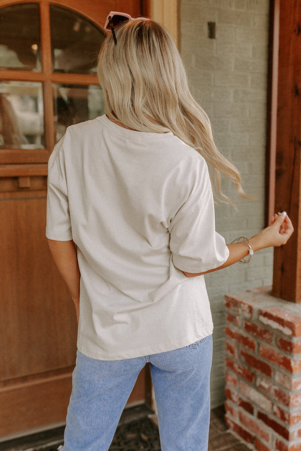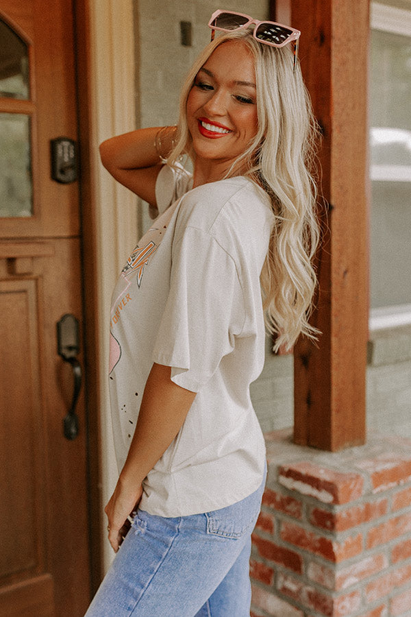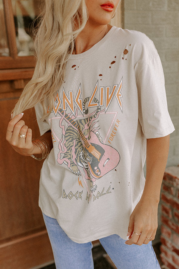 Our trendy vintage light beige colored 'Long Live Distressed Tee' features soft lightweight material with a cute guitar and tiger graphic on the front, a rounded neckline with subtle distressed detailing, loose short sleeves, and a slouched silhouette that ends in a straight hemline!