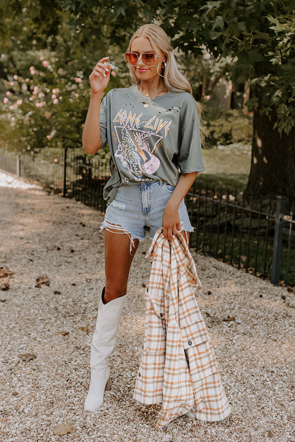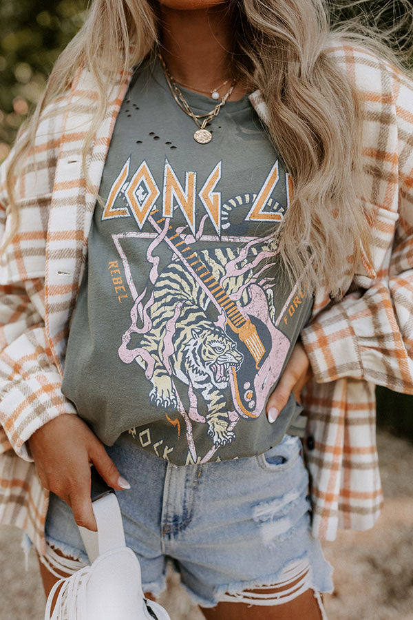 Our trendy sage colored 'Long Live Distressed Tee' features soft lightweight material with a cute guitar and tiger graphic on the front, a rounded neckline with subtle distressed detailing, loose short sleeves, and a slouched silhouette that ends in a straight hemline!