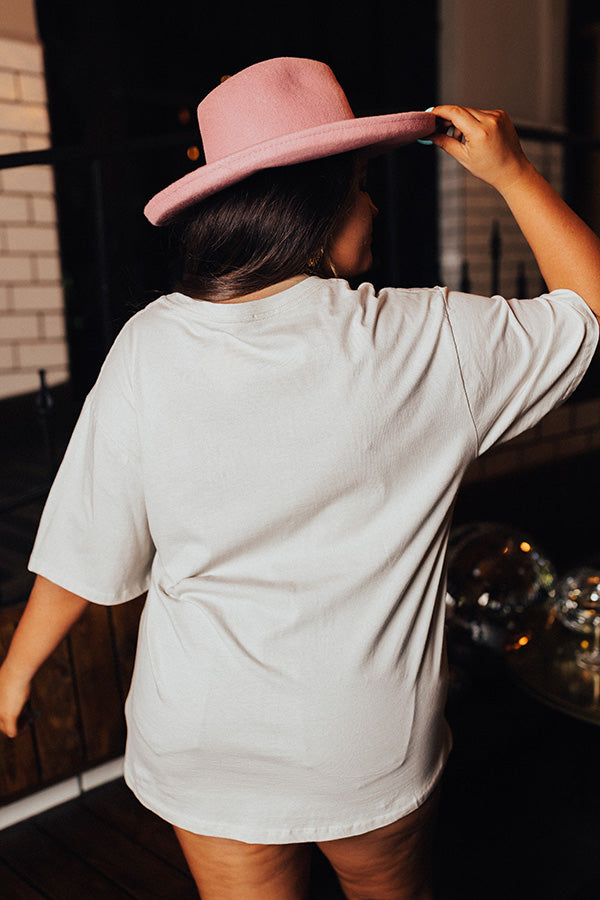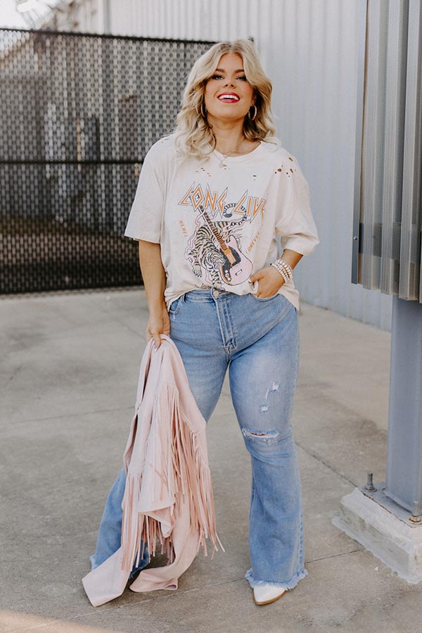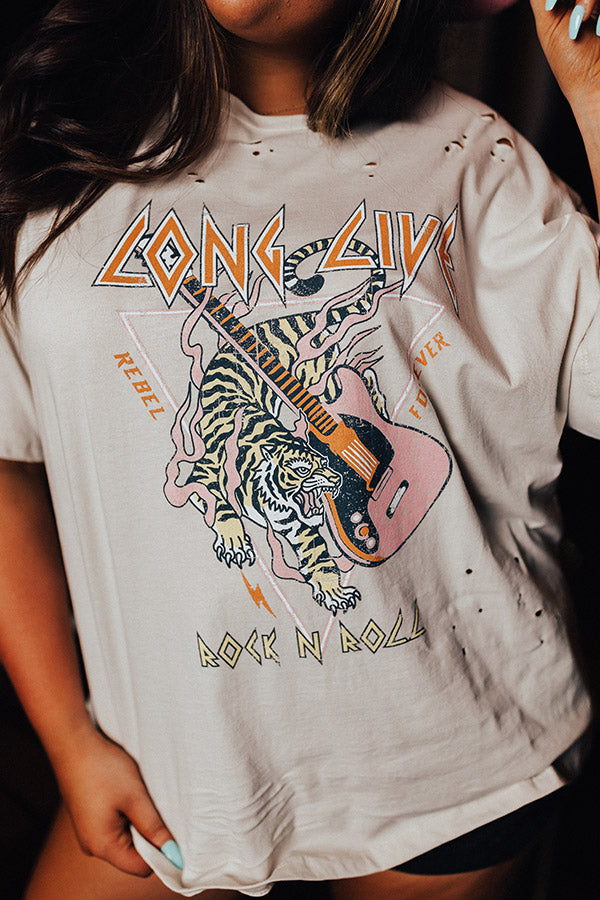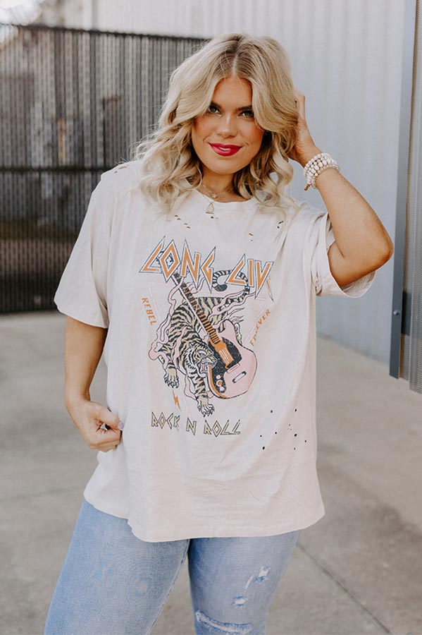 Our light beige colored plus size 'Long Live Rock N Roll Tiger' tee features soft lightweight material with distressed detailing, a cute pink guitar graphic on the front, a rounded neckline, loose short sleeves, and a boyfriend silhouette that ends in a straight hemline!