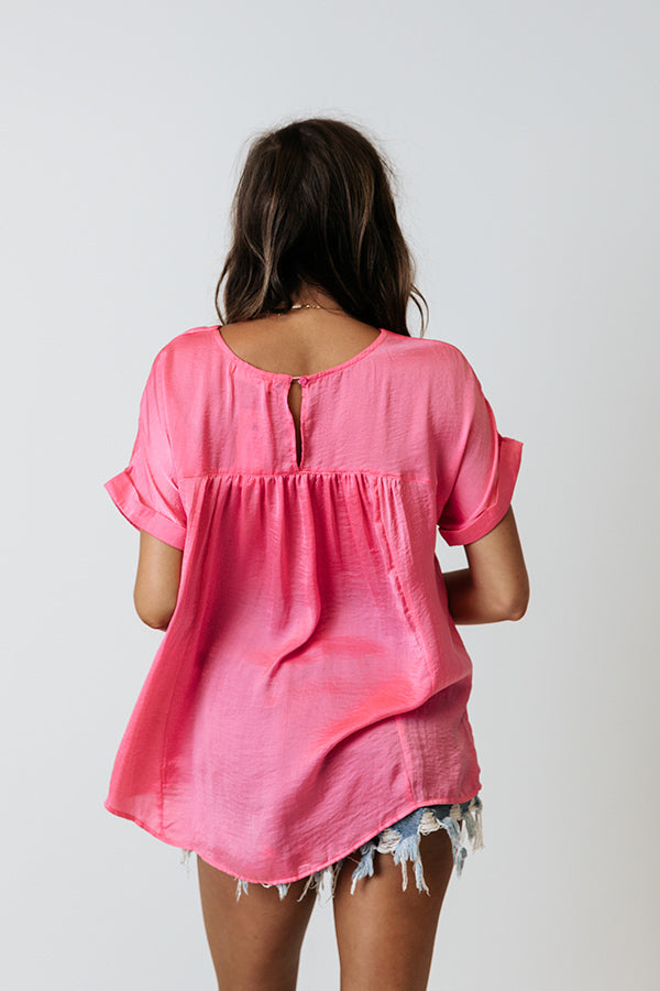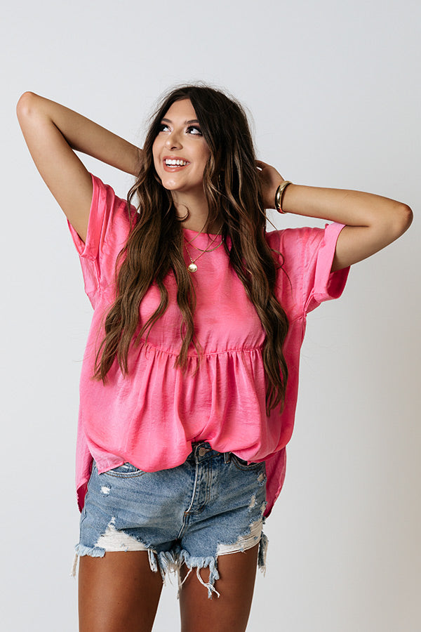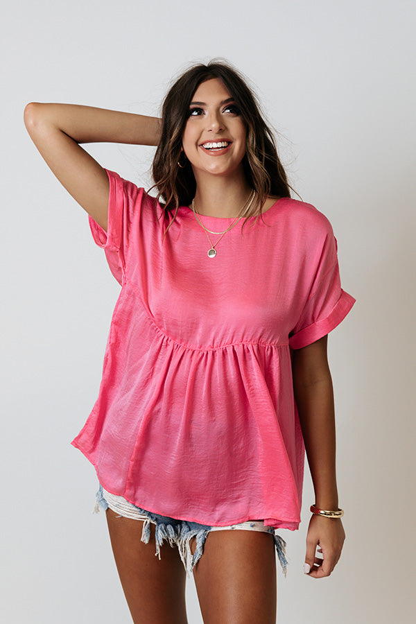 People are sure to look to you for style inspo when you complete your look with this darling pink top featuring lightweight and breezy satin material, a rounded neckline, short sleeves with rolled cuffs, a keyhole accented upper back with a button closure, and a relaxed babydoll silhouette that falls into a straight hemline!