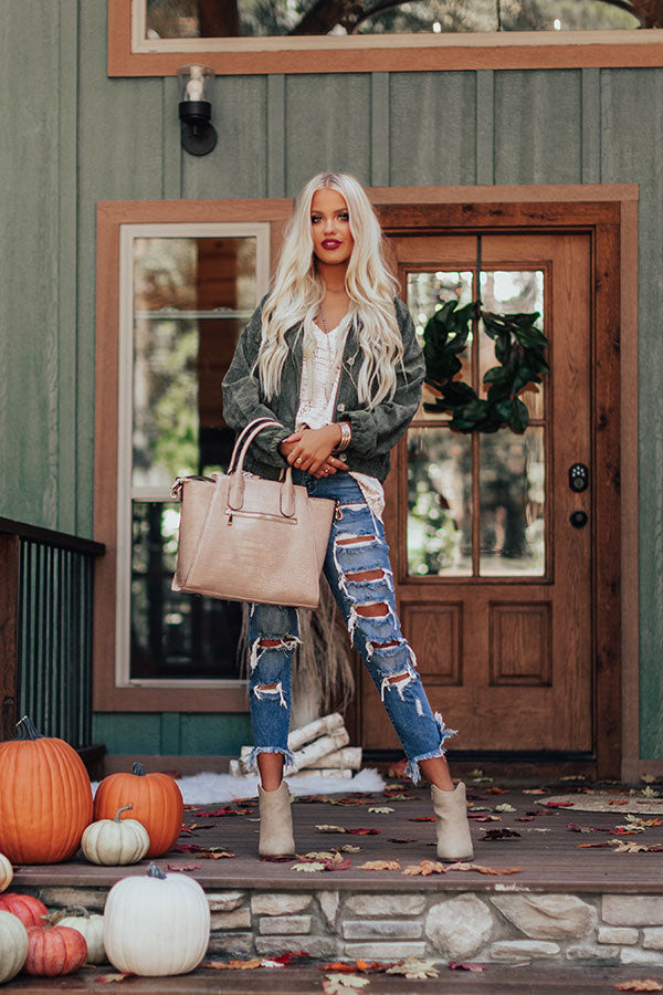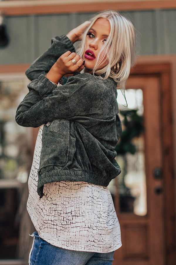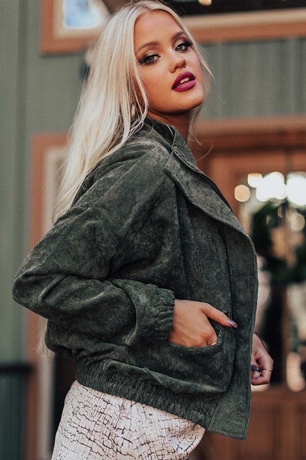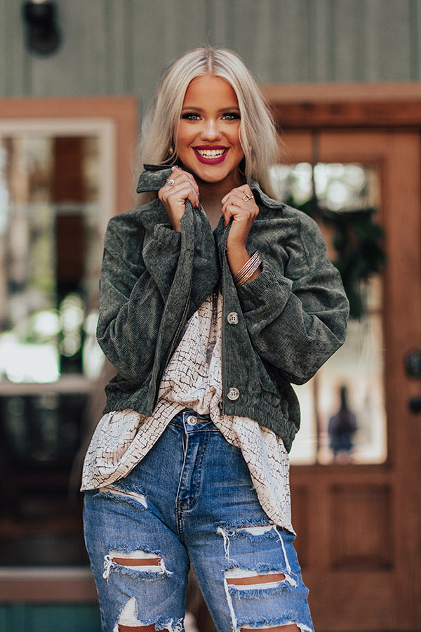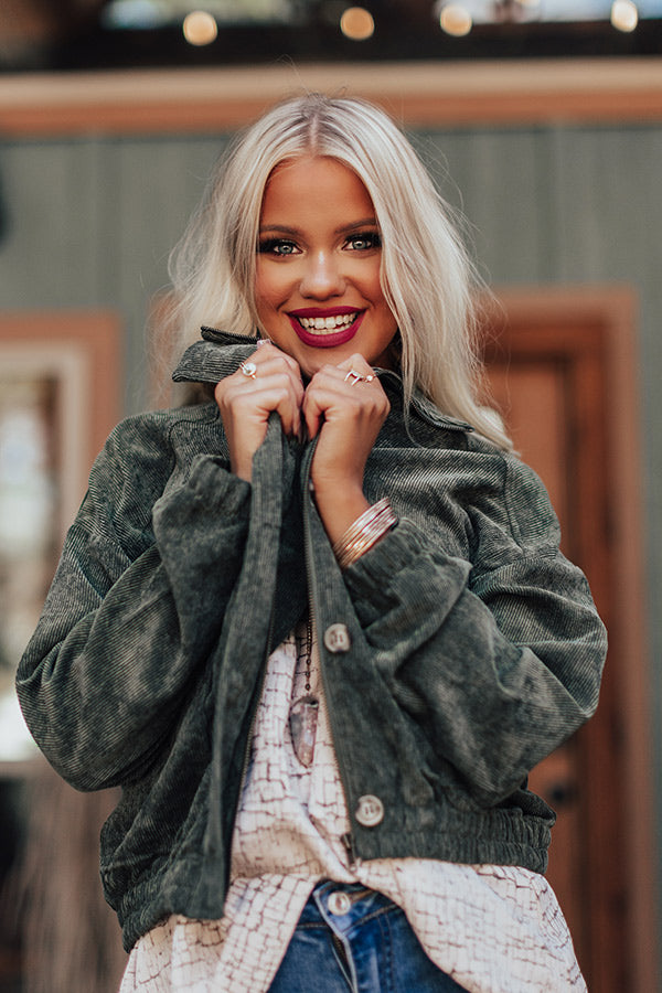You are guaranteed to receive endless compliments when you layer up with our stylish army green colored "Looking Ahead" jacker featuring soft lightweight corduroy material, long loose sleeves with fitted elastic cuffs, a zip and tortoiseshell button closure with a collared neckline, side pockets, and a relaxed bomber style silhouette that ends in a straight hemline! Measurements