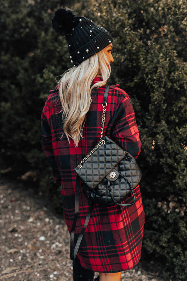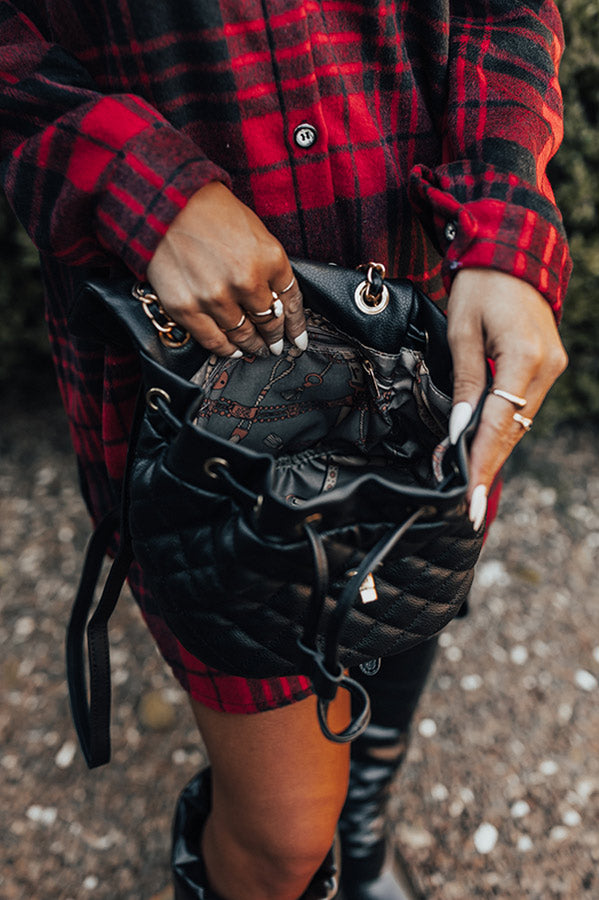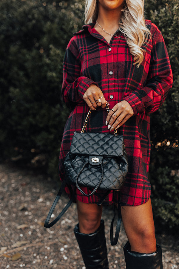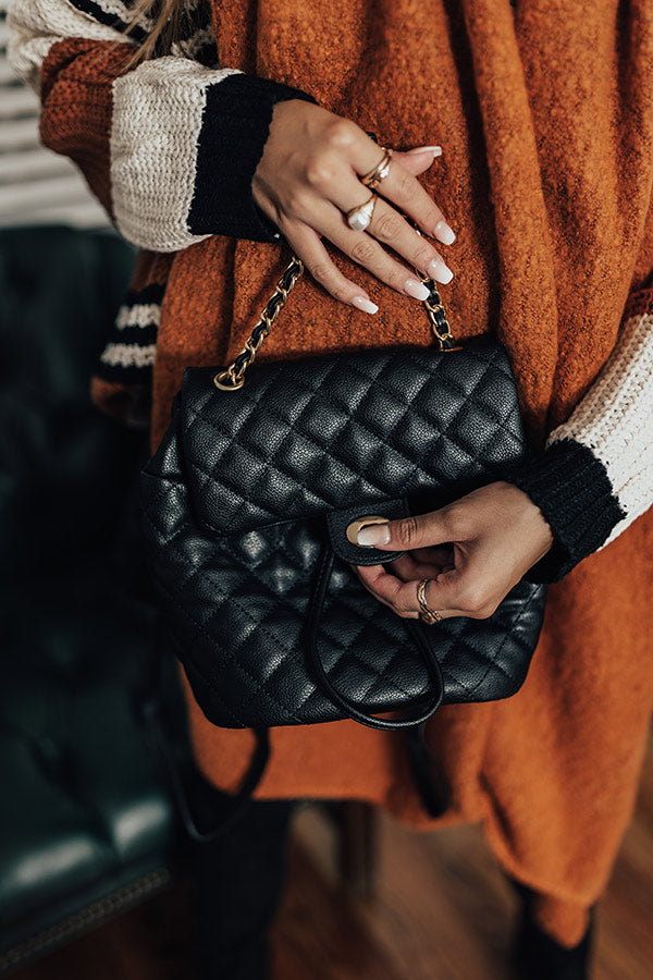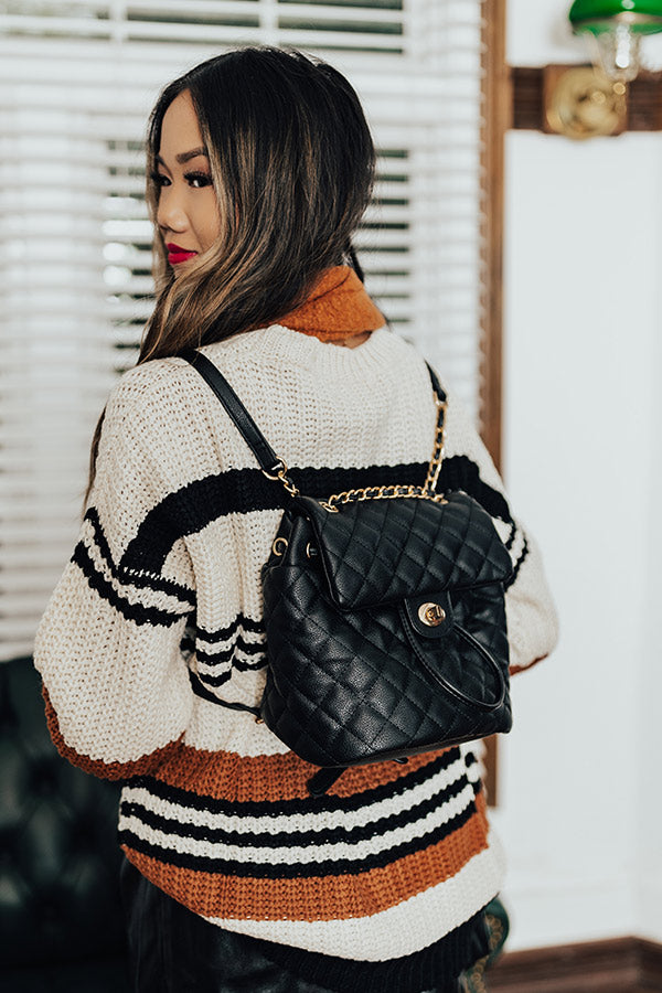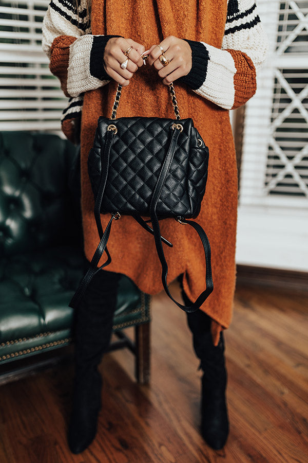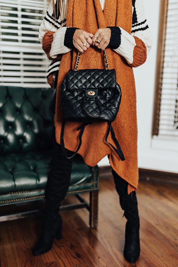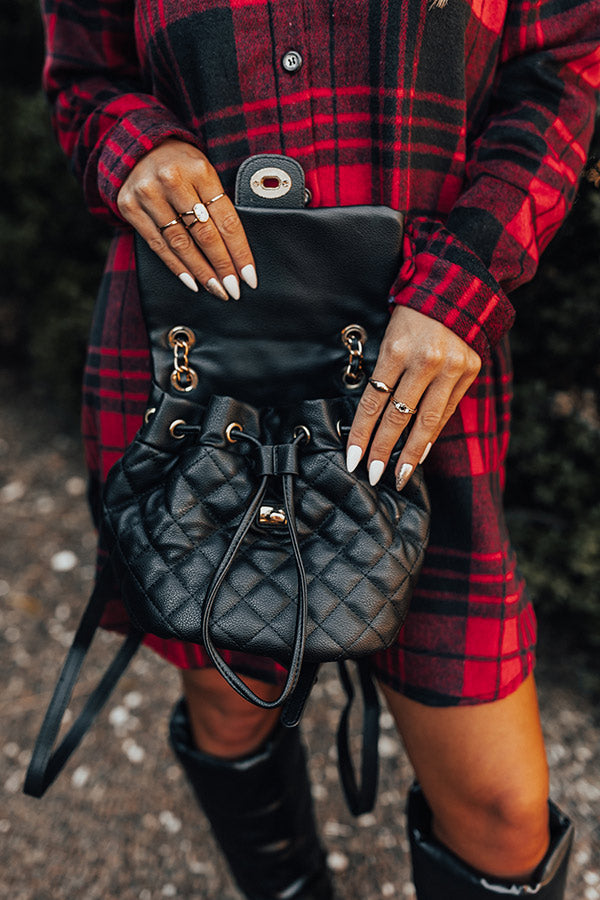 Carry all your holiday essential in style with our trendy black 'Looking At London' backpack featuring sleek faux leather material with quilted texturing, a flap closure with twist hardware, two shoulder straps, and a spacious interior with a cinched closure!