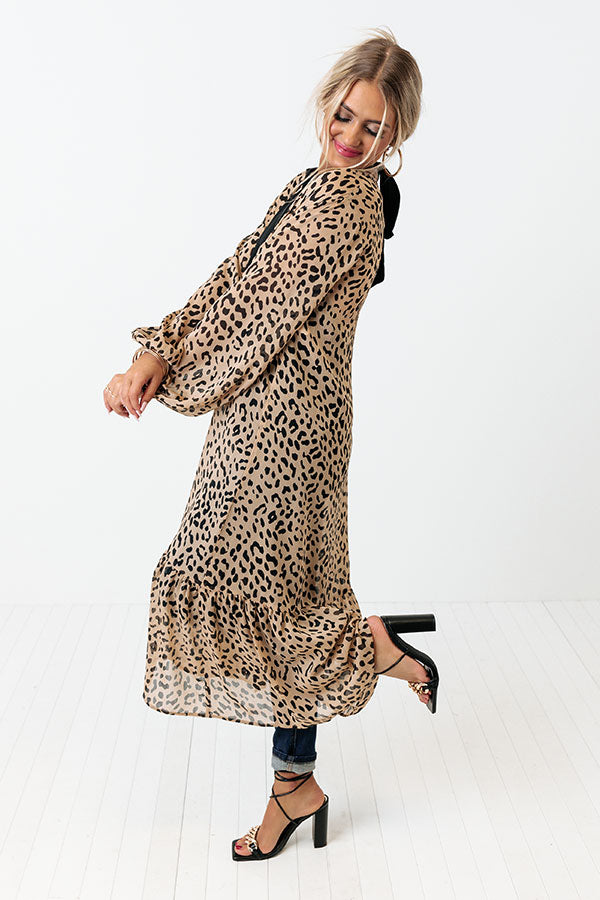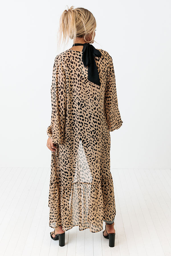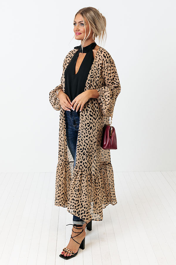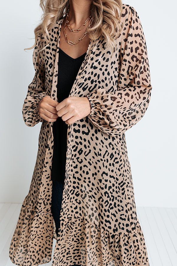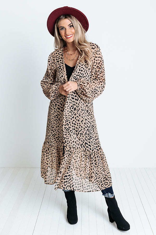 Layer up without adding extra warmth with our pretty warm taupe colored 'Looking At London' duster overlay featuring ultra lightweight material patterned with a beautiful black leopard print, long loose sleeves, and an ultra draped open front silhouette that cascades into a straight mid-calf length hemline!