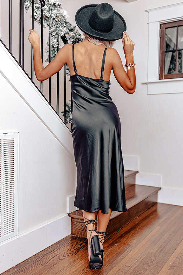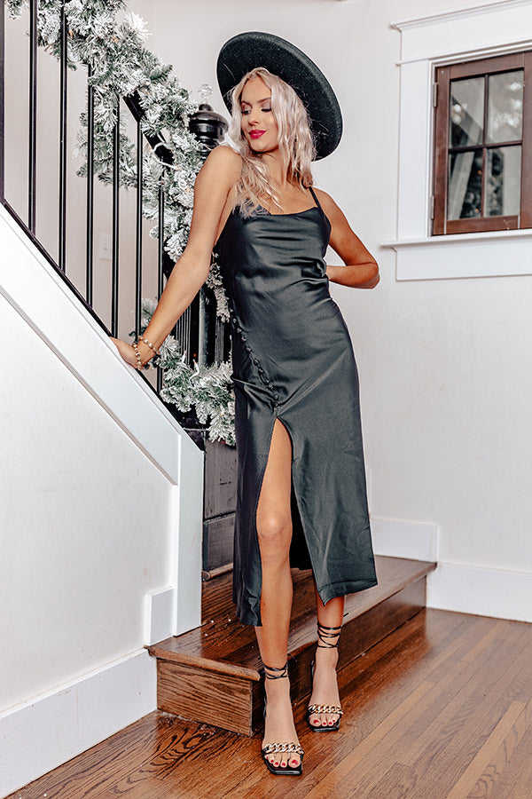 Dress to impress in our beautiful black 'Looking At London' midi featuring sleek lightweight satin material, a subtle draped neckline, pretty button detailing down the side, adjustable shoulder straps, and a flattering silhouette that falls into a straight mid-calf length hemline with an accent slit!