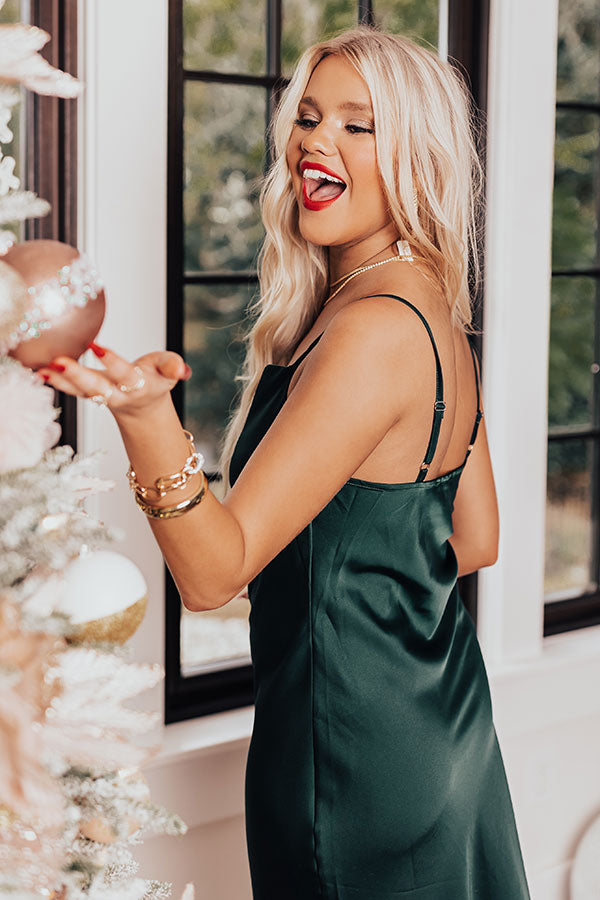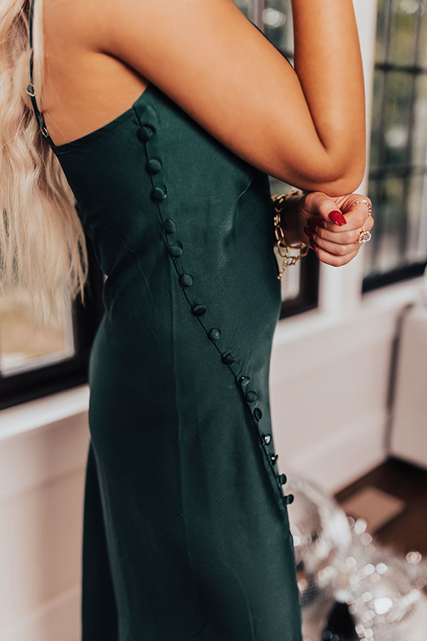 Dress to impress in our beautiful hunter green 'Looking At London' midi featuring sleek lightweight satin material, a subtle draped neckline, pretty button detailing down the side, adjustable shoulder straps, and a flattering silhouette that falls into a straight mid-calf length hemline with an accent slit!