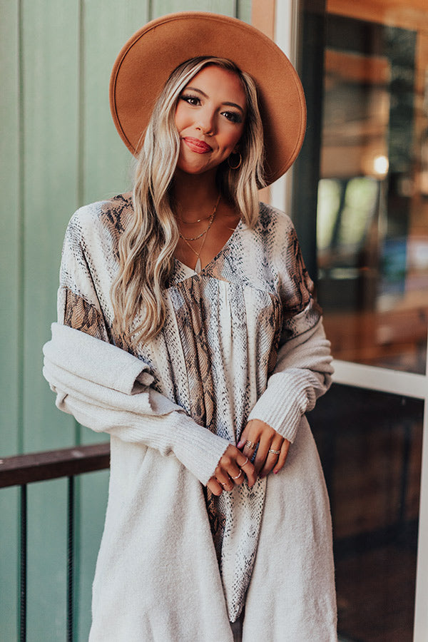 You will no longer have to look for a dress you will love when you add this cutie to your cart with its lightweight flowy material, bold grey and neutral hued snake print, high v-cut neckline, long bubble sleeves with fitted elastic cuffs, and an ultra relaxed silhouette that falls into a rounded mid-thigh length hemline! Measurements