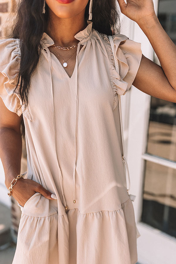 - A v-cut neckline with a front tie feature with accent beads and ruffle detail