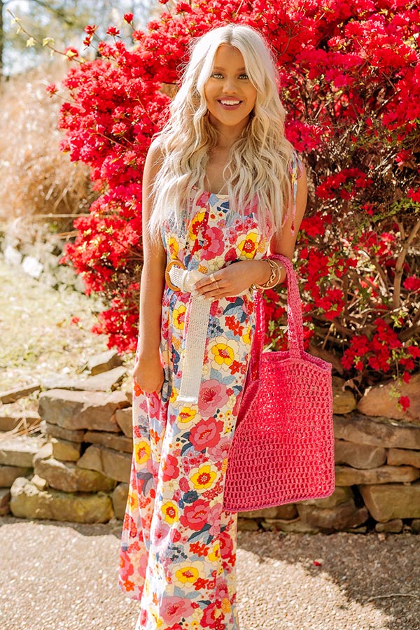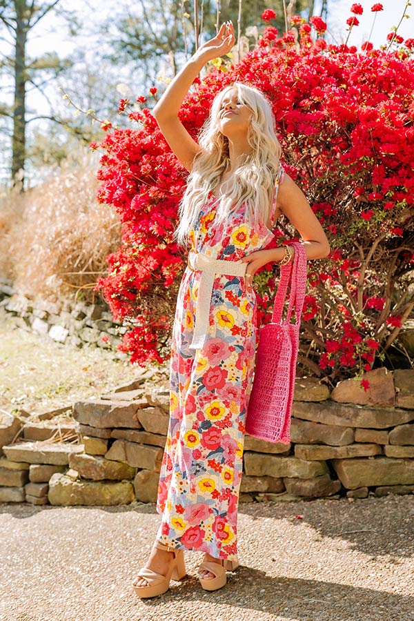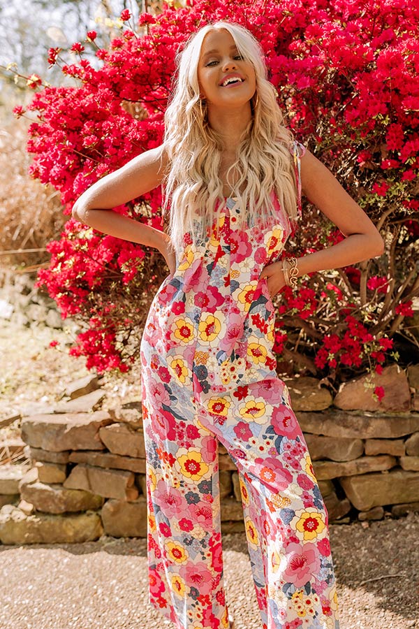 You will surely be looking sassy when you arrive in this eye-catching jumpsuit featuring lightweight material patterned with a lively hot pink, light pink, yellow, and sky blue hued floral print, a scooped neckline with tie closure spaghetti straps, and a relaxed but flattering silhouette that ends in straight ankle-length hemliens! on products