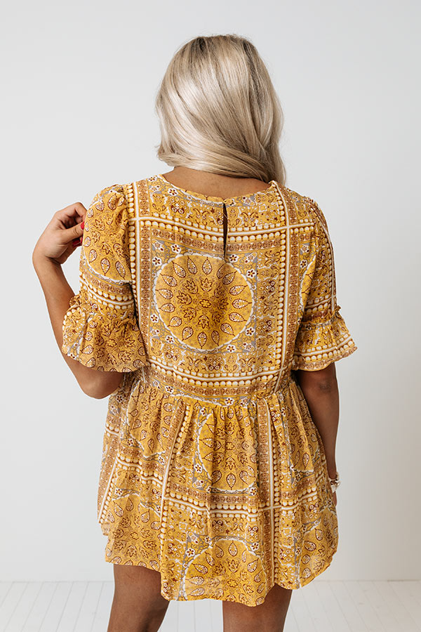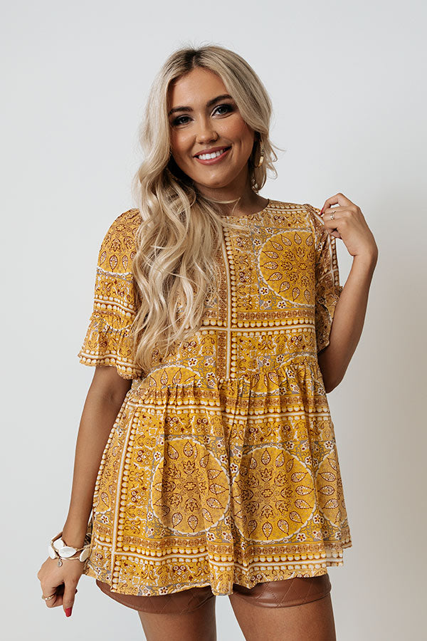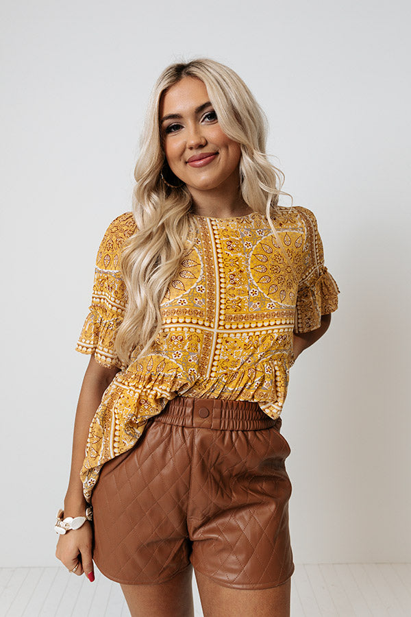 Life's a party, so dress like it in our eye-catching 'Los Feliz Shift Top' featuring lightweight material patterned with a gorgeous golden honey hued vintage print, a rounded neckline, short sleeves with flared cuffs, a keyhole accented upper back with a button closure, and a relaxed silhouette that falls into a flirty peplum hemline!