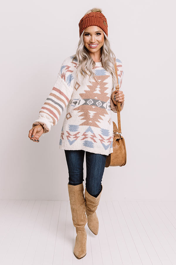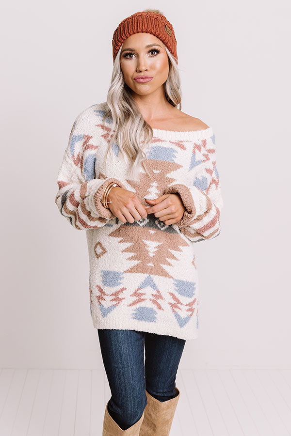 Stay cozy this fall in our charming ivory colored "Lost In The Adirondacks Sweater" featuring thick tight knit material patterned with a light blue and brown colored aztec pattern, a high rounded hemline, ribbed trim detailing, long loose sleeve with fitted cuffs, and a relaxed open front silhouette that falls into a straight tunic-length hemline!