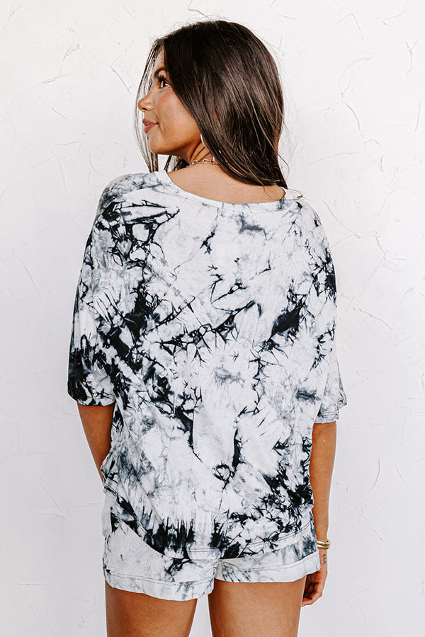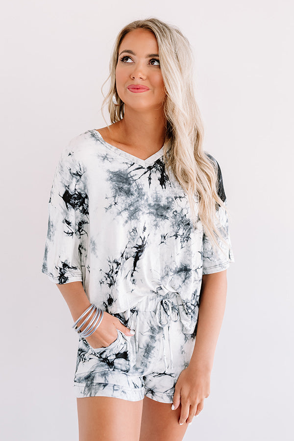 You will be "lounging in bliss" when you wear this trendy shift tee featuring ultra soft lightweight material patterned with grey/black tie dye, a high v-cut neckline, short loose sleeves, and a relaxed silhouette that falls into a straight hemline! This comfy piece styles perfectly with our matching "Lounging In Bliss Tie Dye Shorts in Grey," a scrunchie, and some fuzzy slippers for the ultimate two-piece lounge look!