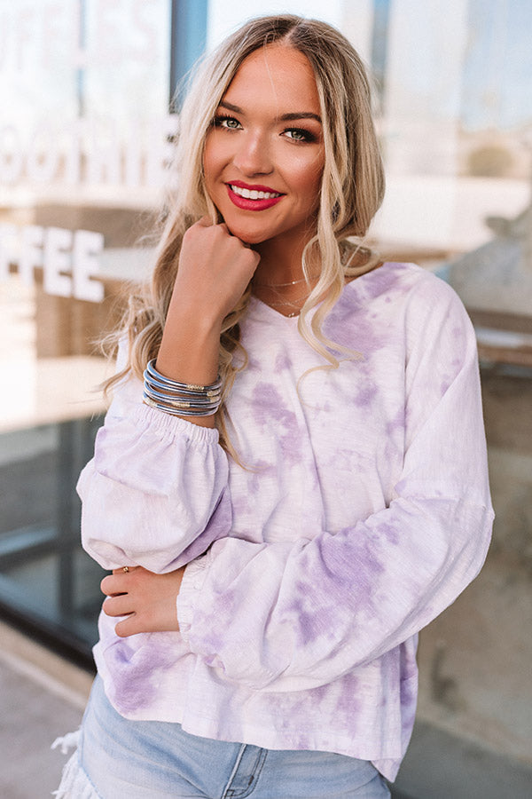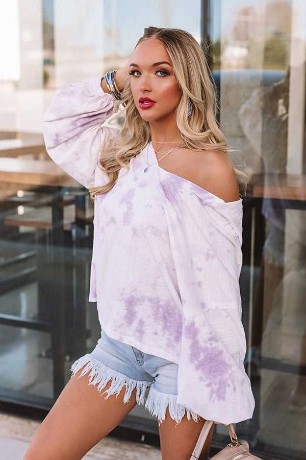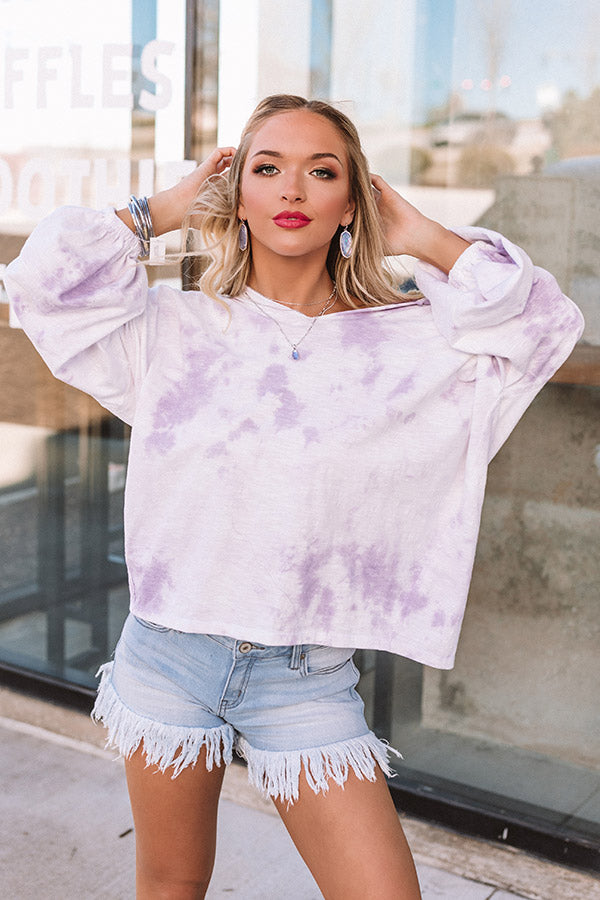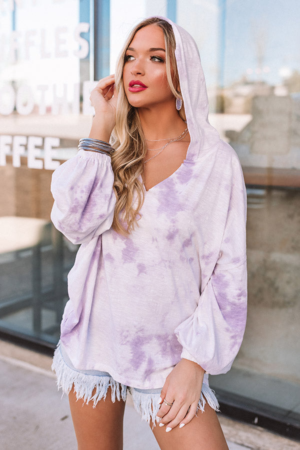 There is no better piece to wear while "lounging in L.A." than this adorable hoodie featuring soft lightweight material patterned with a lavender and white tie dye, a v-cut neckline with a hooded back that can be worn off one shoulder, long oversized bubble sleeves with elastic banded cuffs, and a relaxed silhouette that falls into a straight hemline! We have styled this cutie with some ultra frayed denim shorts, a neutral backpack, and a matching silver sneaker and bracelet set, but you can also wear it with some distressed white skinnies, our "Relaxing Poolside Sunnies in Purple," and "The Avonlea Espadrille in Clear!" Measurements