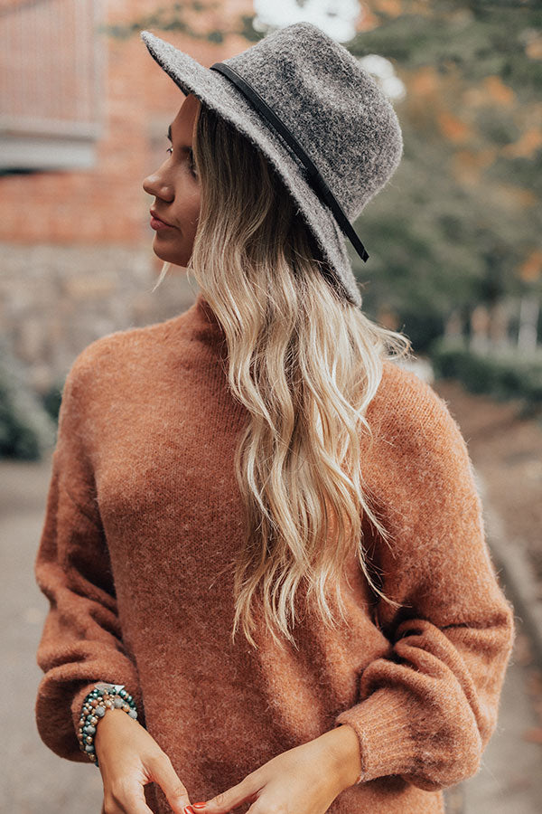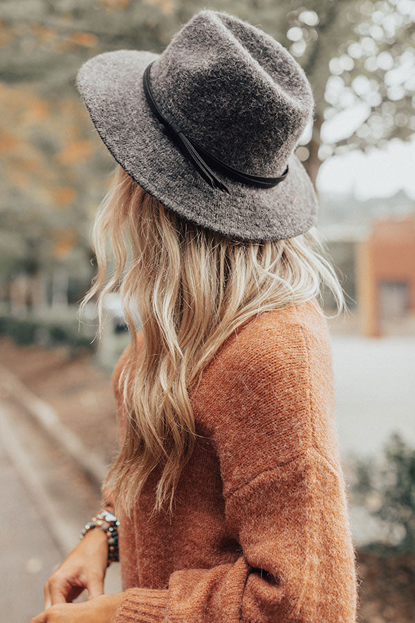 There is no better accessory to wear while "lounging in London" than this dark grey hat with knit material, a wide brim, and an accent ribbon!