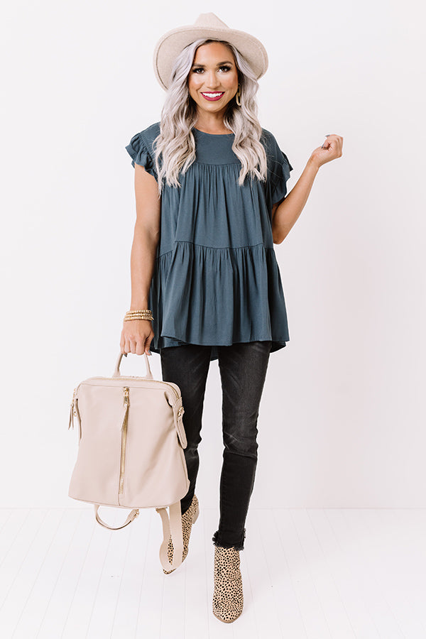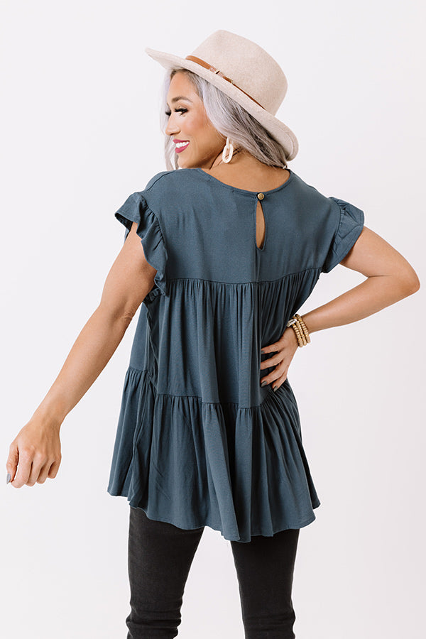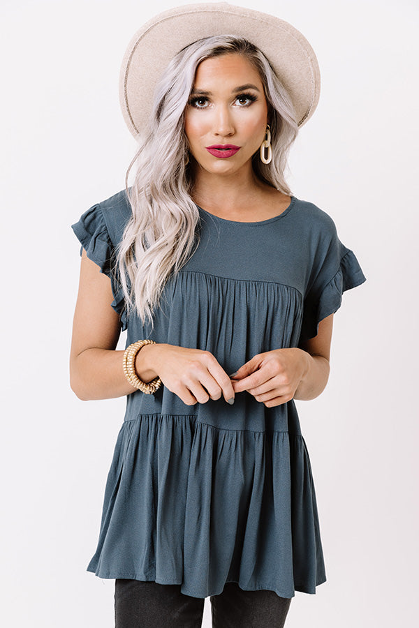 We have no doubt you will love this adorable slate colored top "a latte" with its lightweight flowy material, high rounded material, short loose sleeves with ruffled trim detailing, a keyhole accented upper back with a button closure, and a relaxed tiered babydoll silhouette that falls into an uneven tunic-length hemline! Measurements