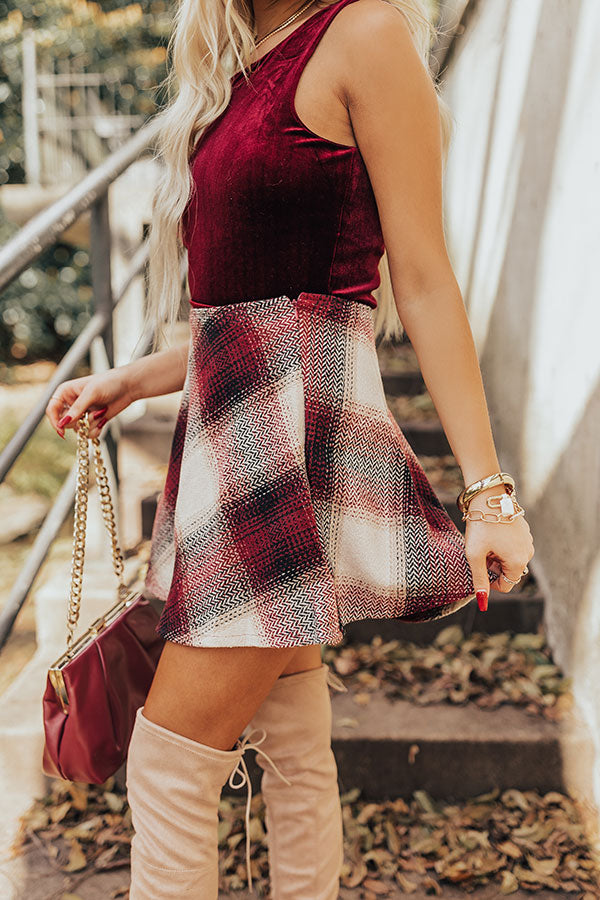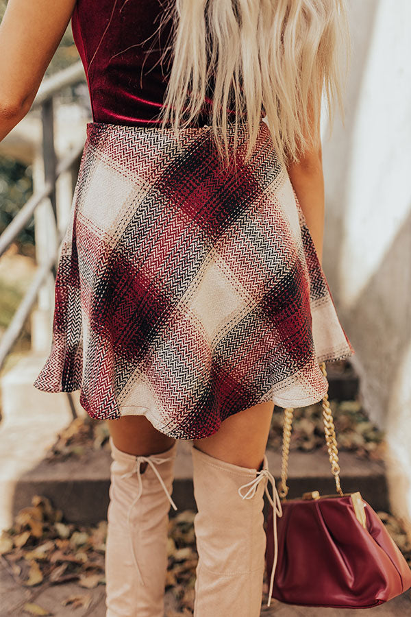 Get in the holiday spirit with our adorable ivory hued 'Love And Joy' skirt featuring lightweight material patterned with a large red and black plaid print, a side zip closure, and a flattering silhouette that flares into a straight mid-thigh length hemline! Measurements